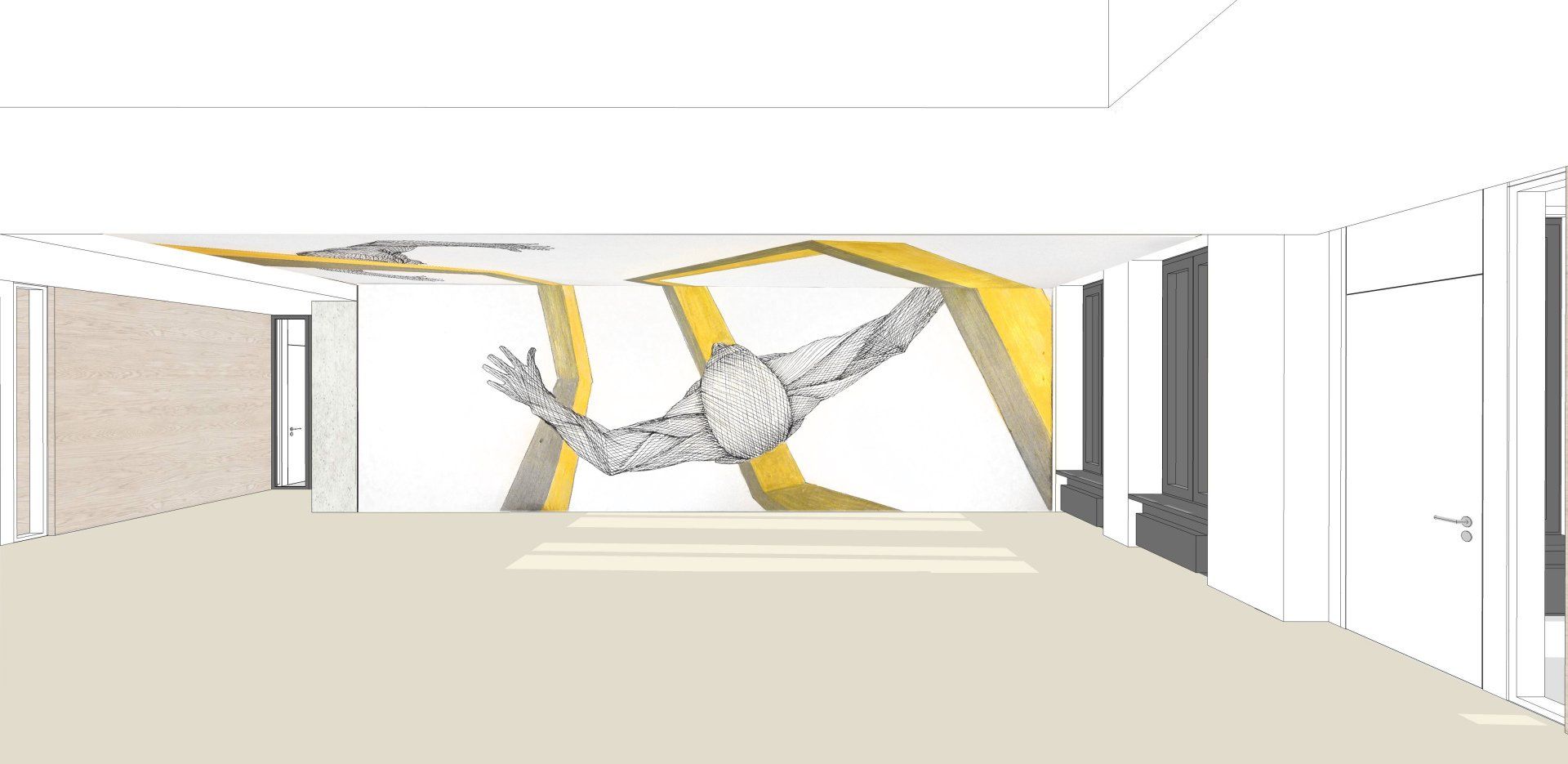 The starting point for the design are the two multi-story foyer walls (each approx. 100m2), executed in situ as elaborate manual paintings and drawings (ink and acrylic).