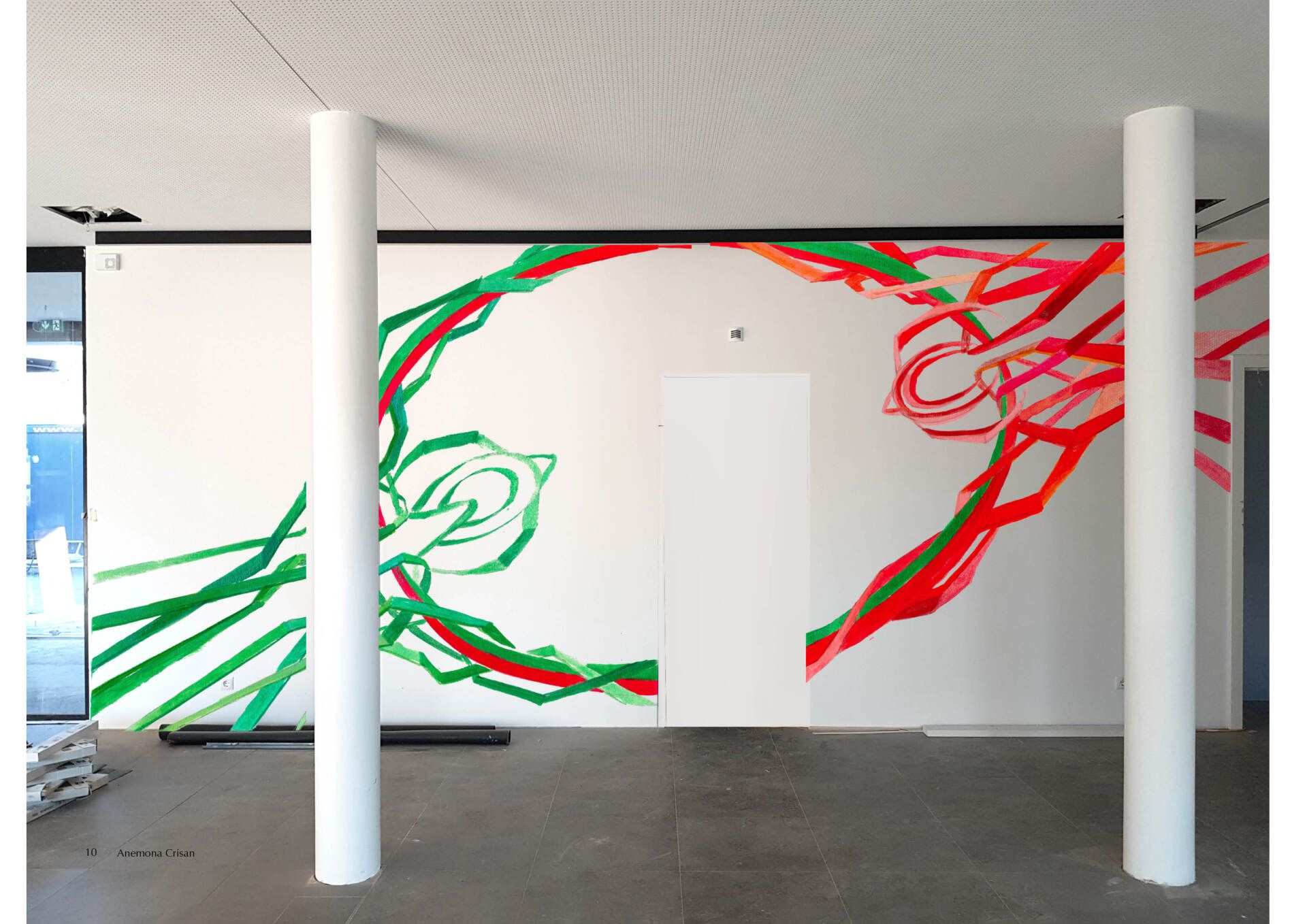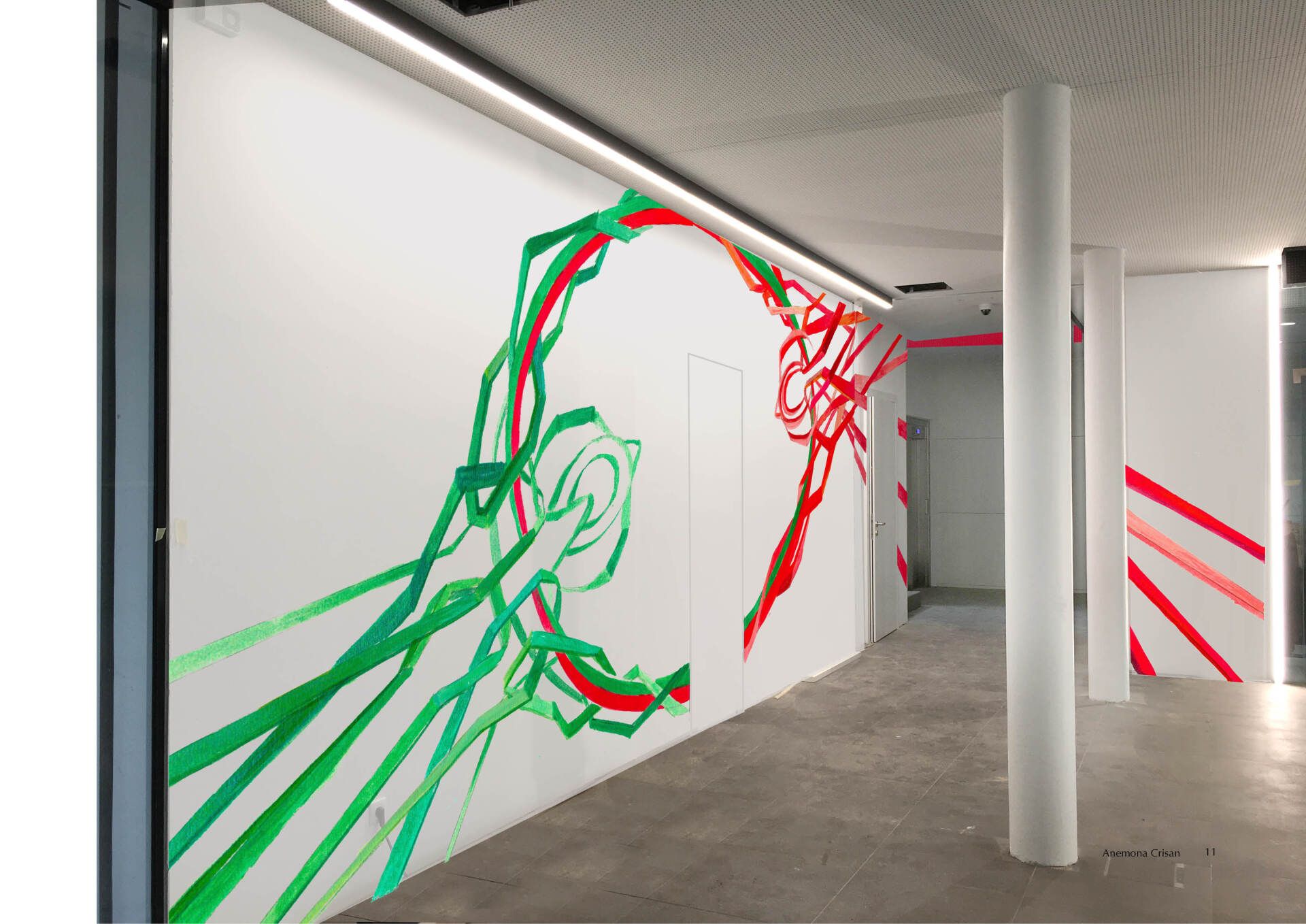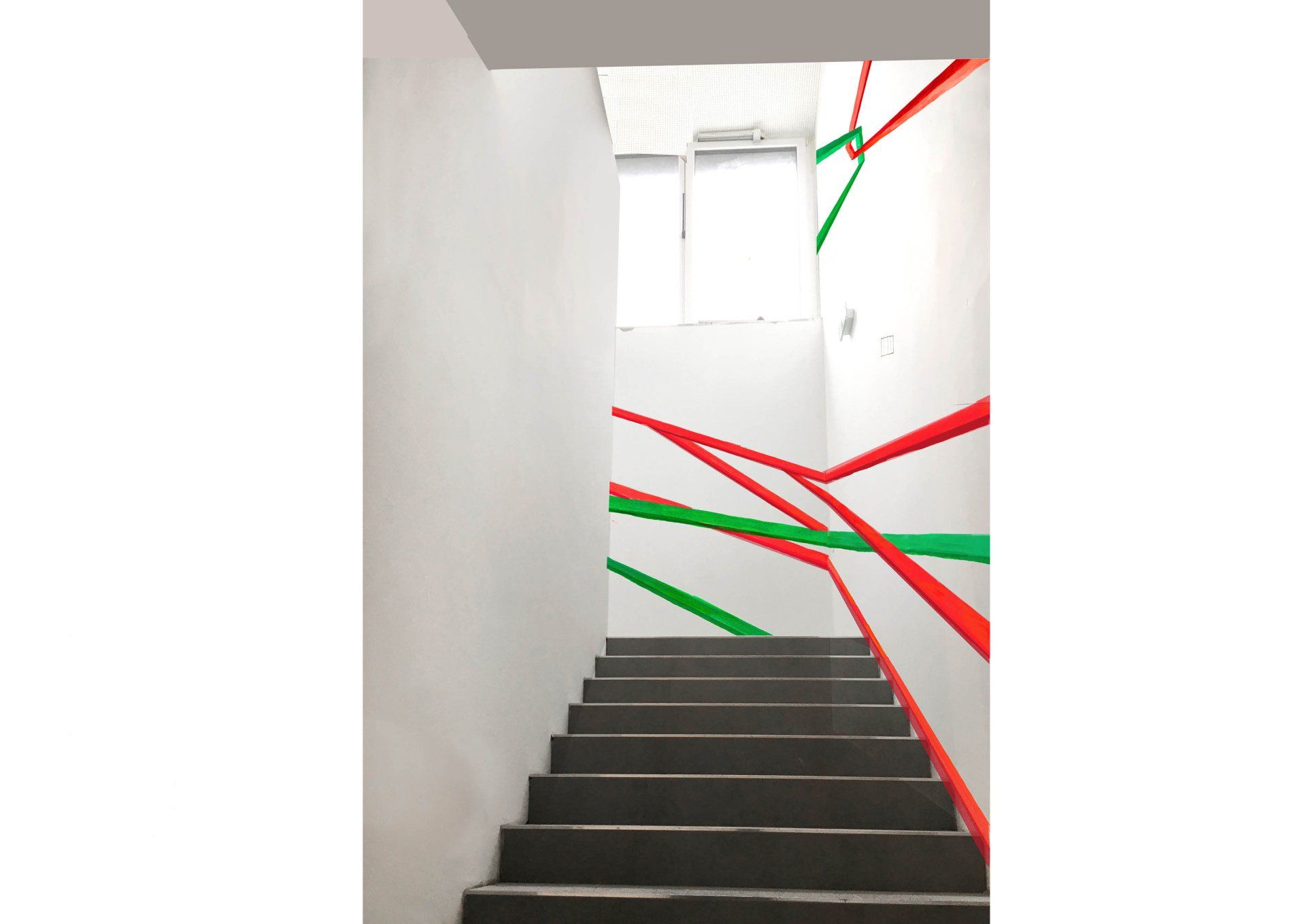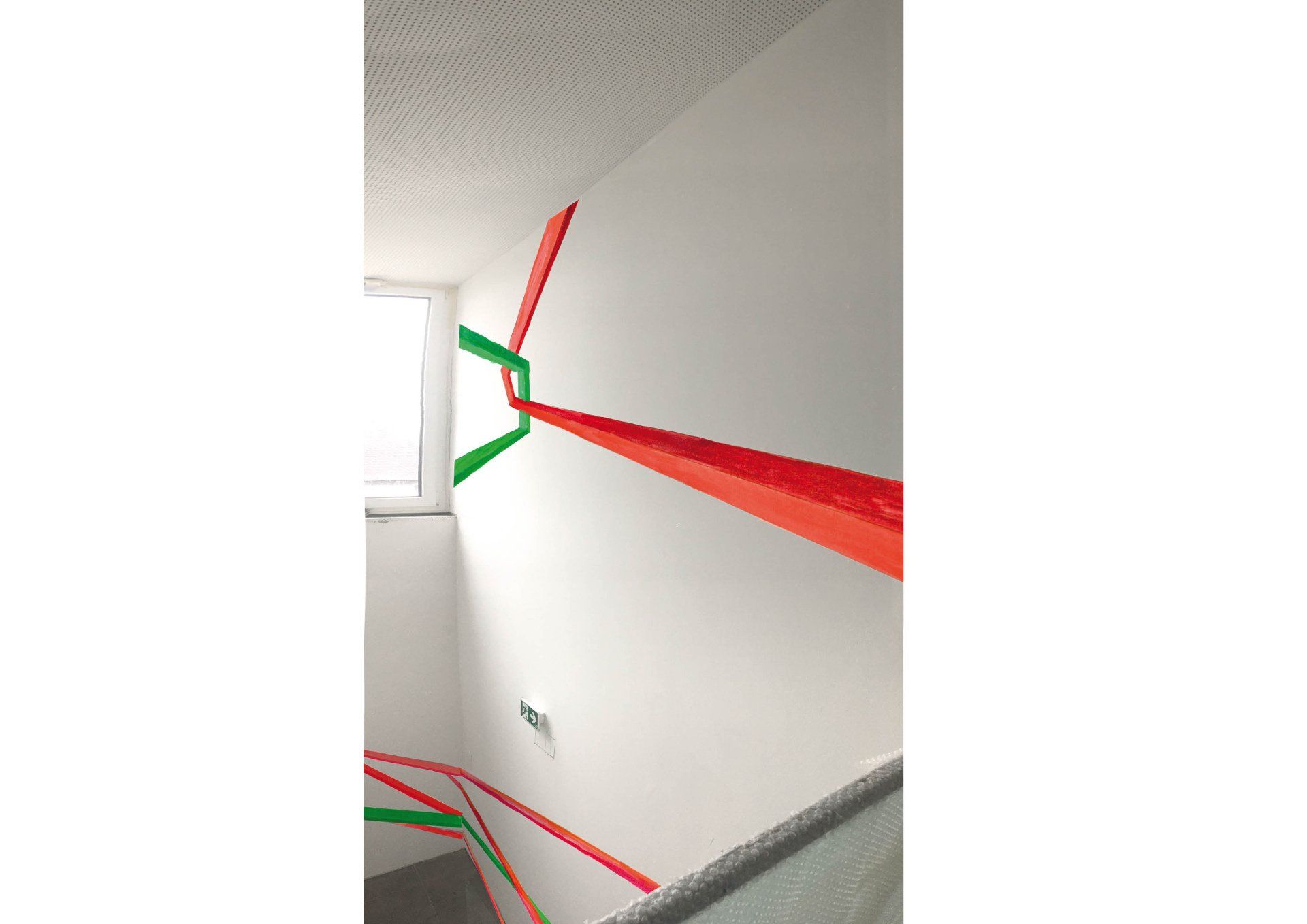The figures simultaneously and fundamentally represent the encounter between people, between visitors and officials. From this encounter, red and green lines now continue along the walls and lead from the foyer on the ground floor over the wall object of the staircase up to the upper floor. This is where the story comes to an end: in which two of these lines – one green and one red – hook together like two bent arms.