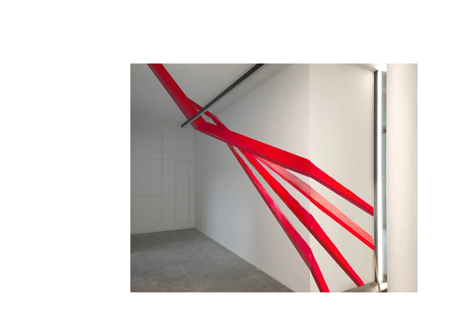 The glass wall of the reception dominates the reception area and is therefore a "business card" for the company. The subject is a thematic encounter between my artistic theme - the relationship between people and architecture - with the company's theme (real estate construction and sales) and STRABAG's slogan "Teams Work". Here we see three figures connected to each other by red architectural elements that move, build and change them.