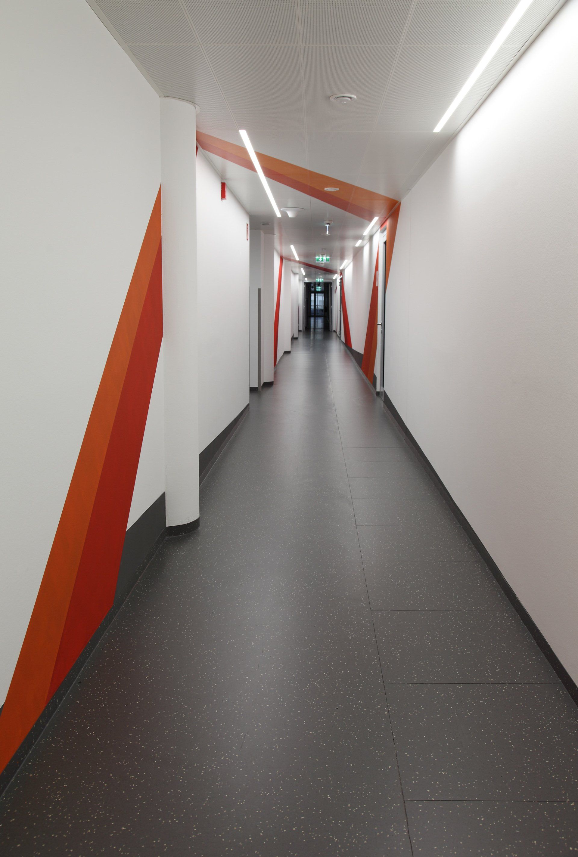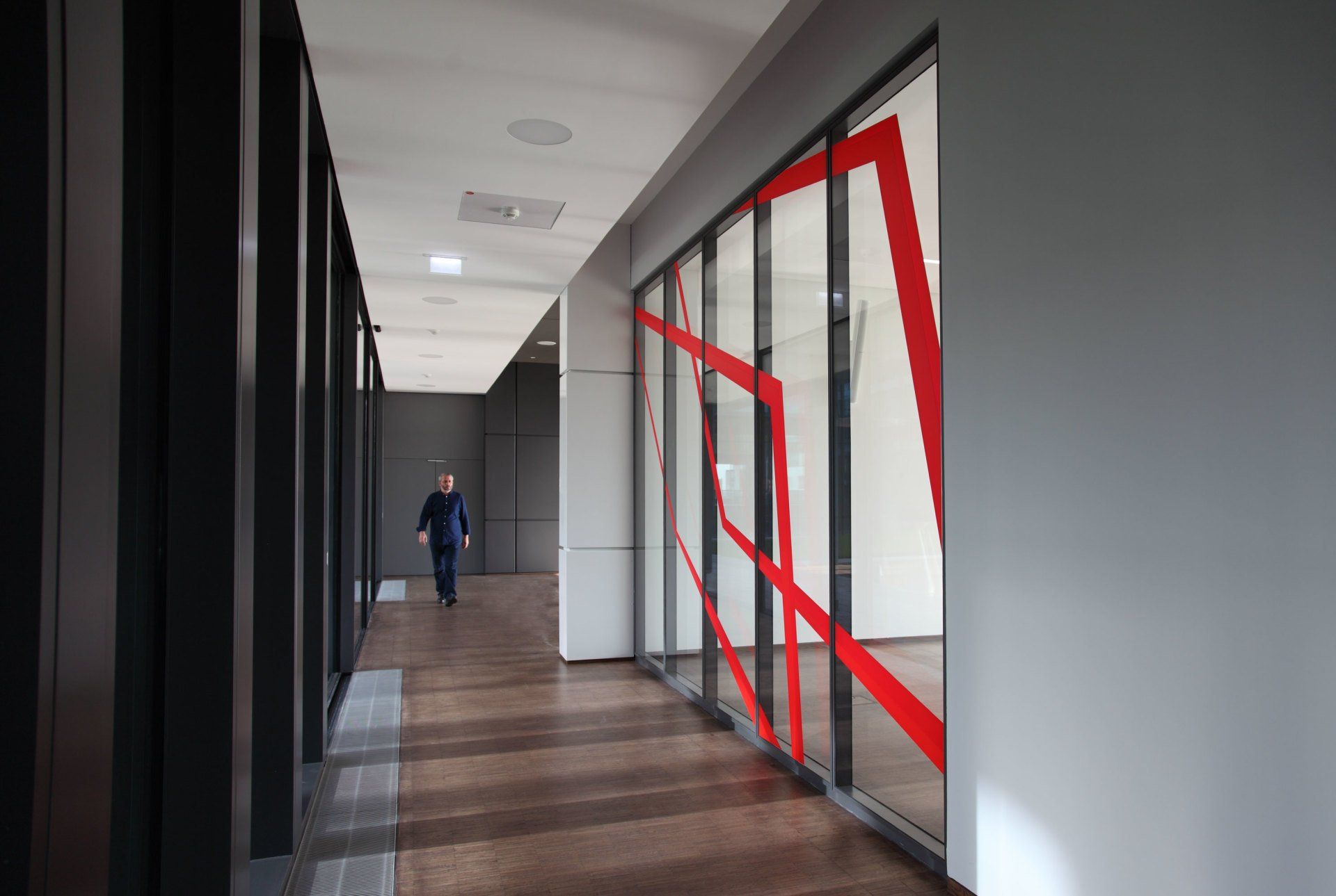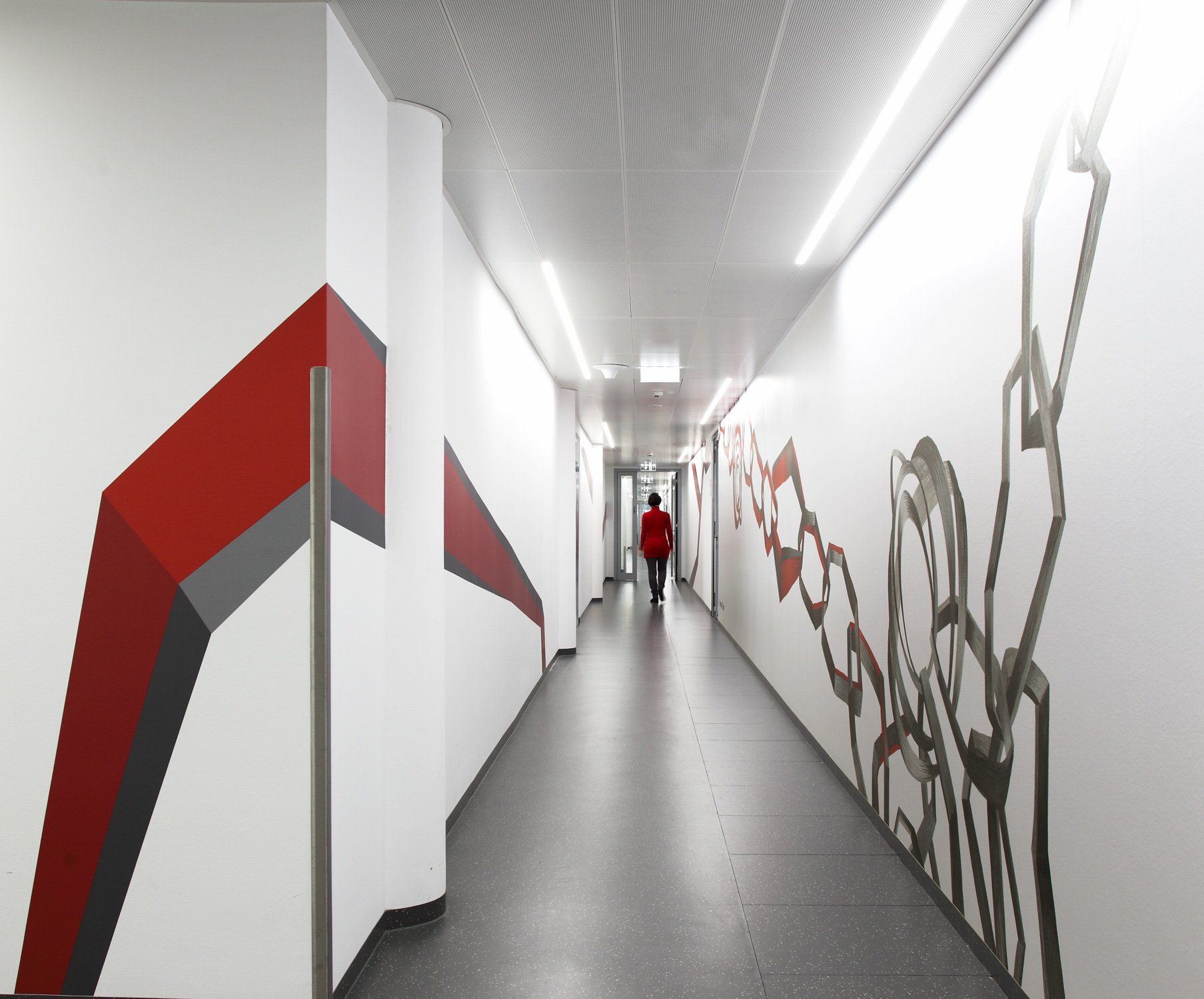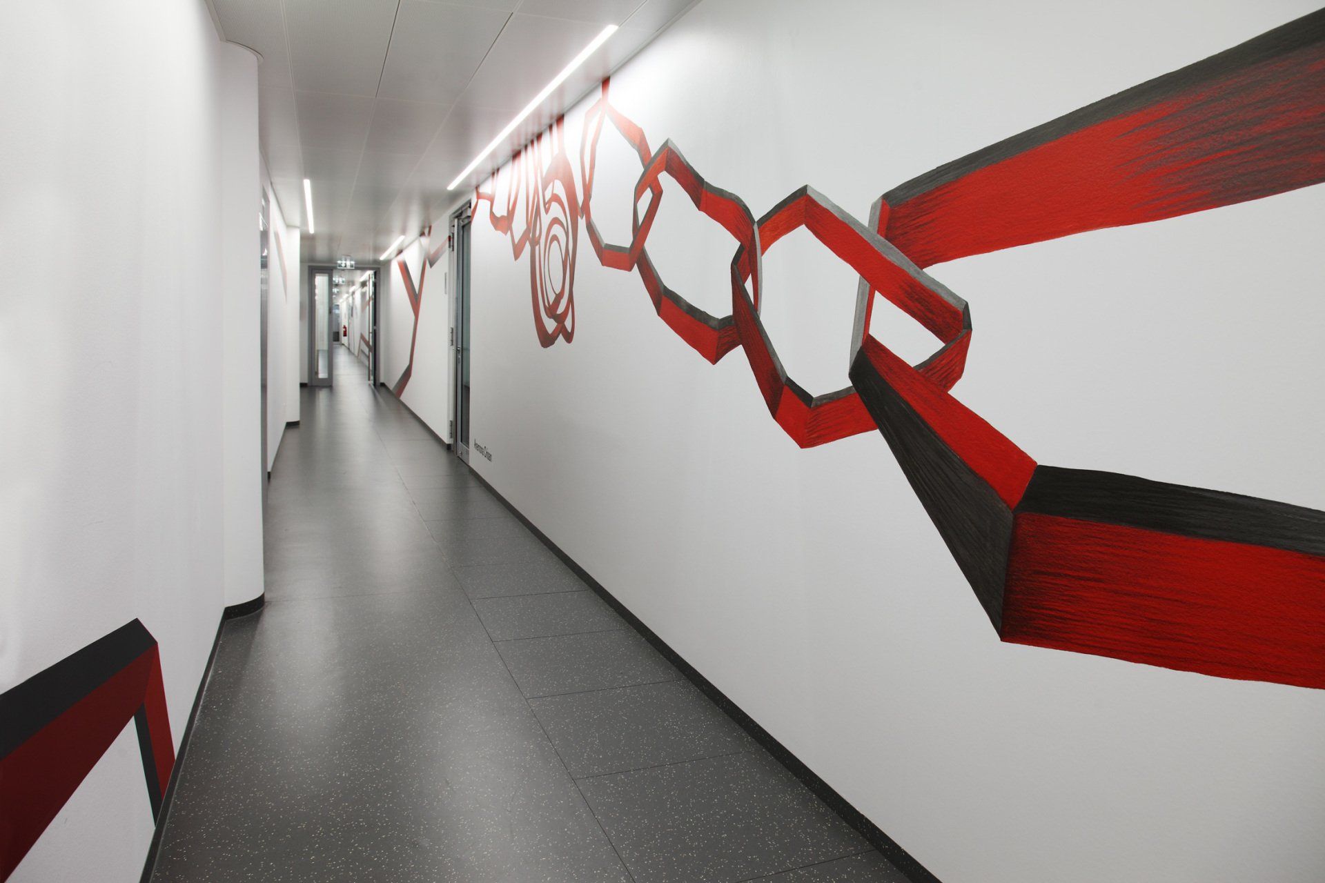 STRABAG - Real Estate has its new headquarters on the 3rd and 4th floors of the TechGate building in Vienna. I was invited to implement an artistic concept for the 4th floor, which creates a new location and identification of the company with the new building in the existing spatial structures of TechGate. At the same time, the difficult spatial orientation should be made easier and a connection between reception, sales area and aisle established.