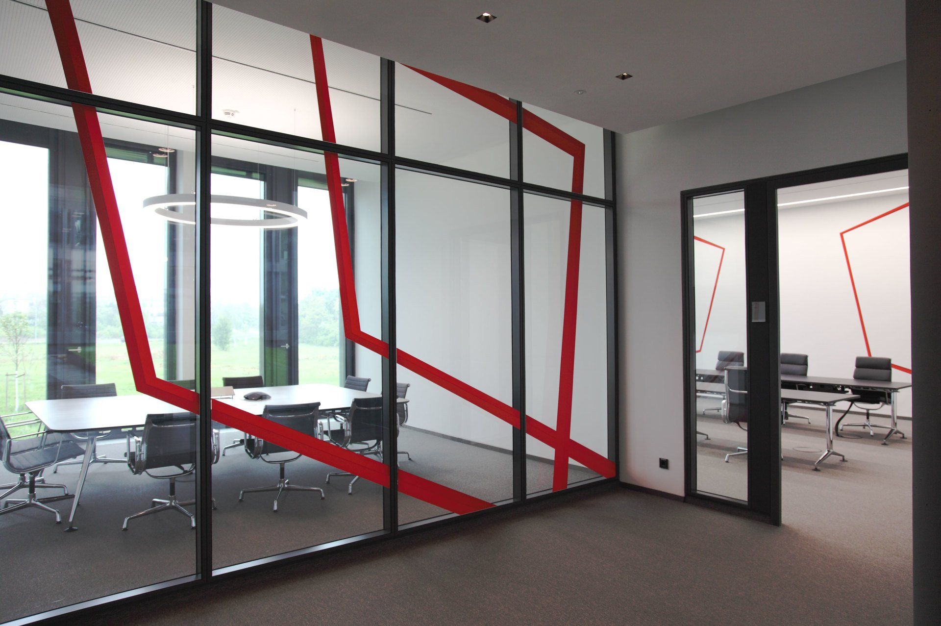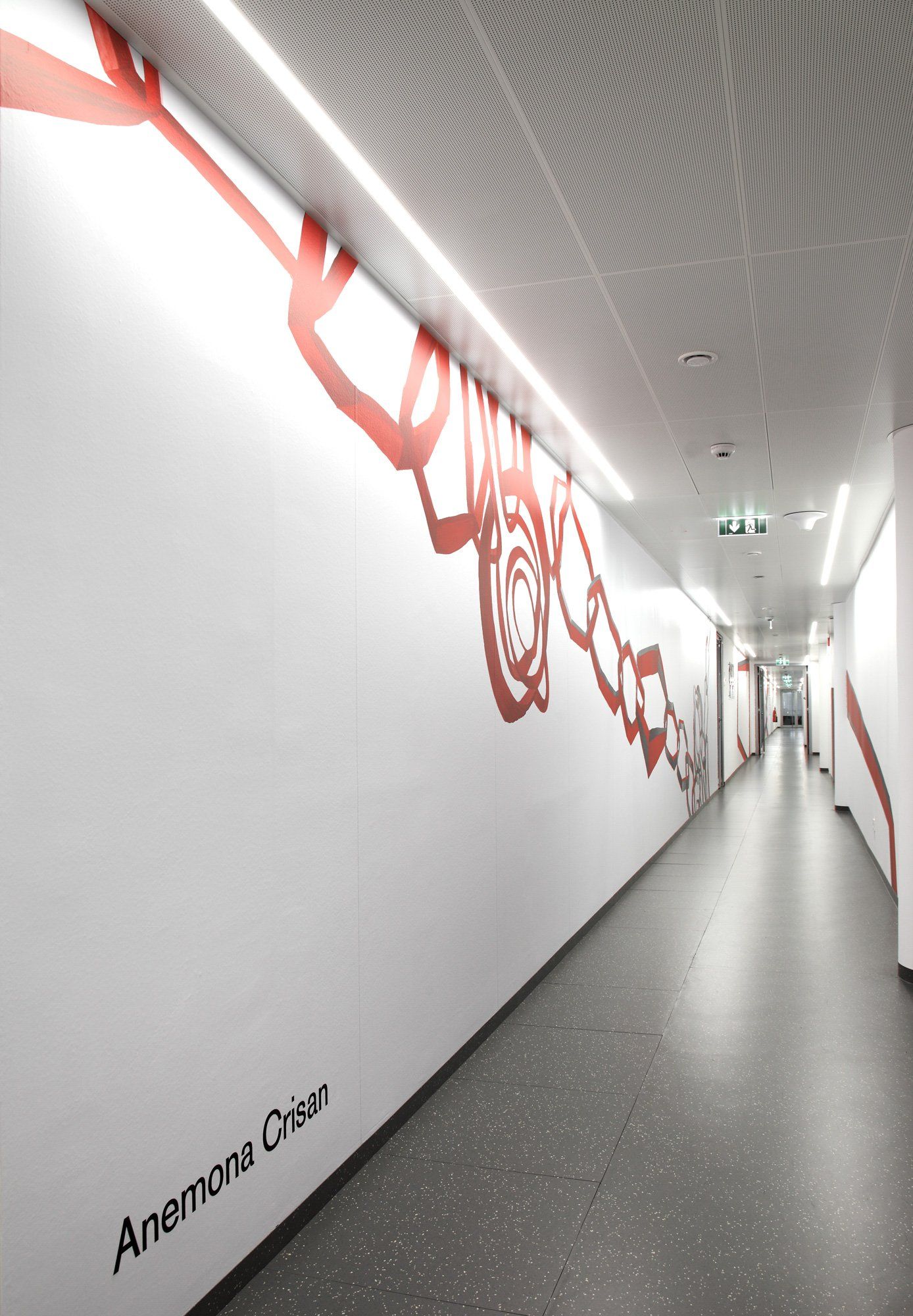 Execution: corridor: acrylic painting in situ, reception: glass foil printing, sales rooms: printing on plexiglass.