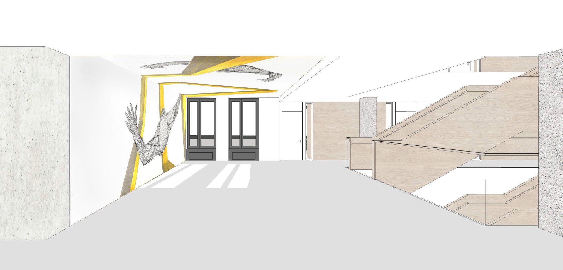 The starting point for the design are the two multi-story foyer walls (each approx. 100m2), executed in situ as elaborate manual paintings and drawings (ink and acrylic).