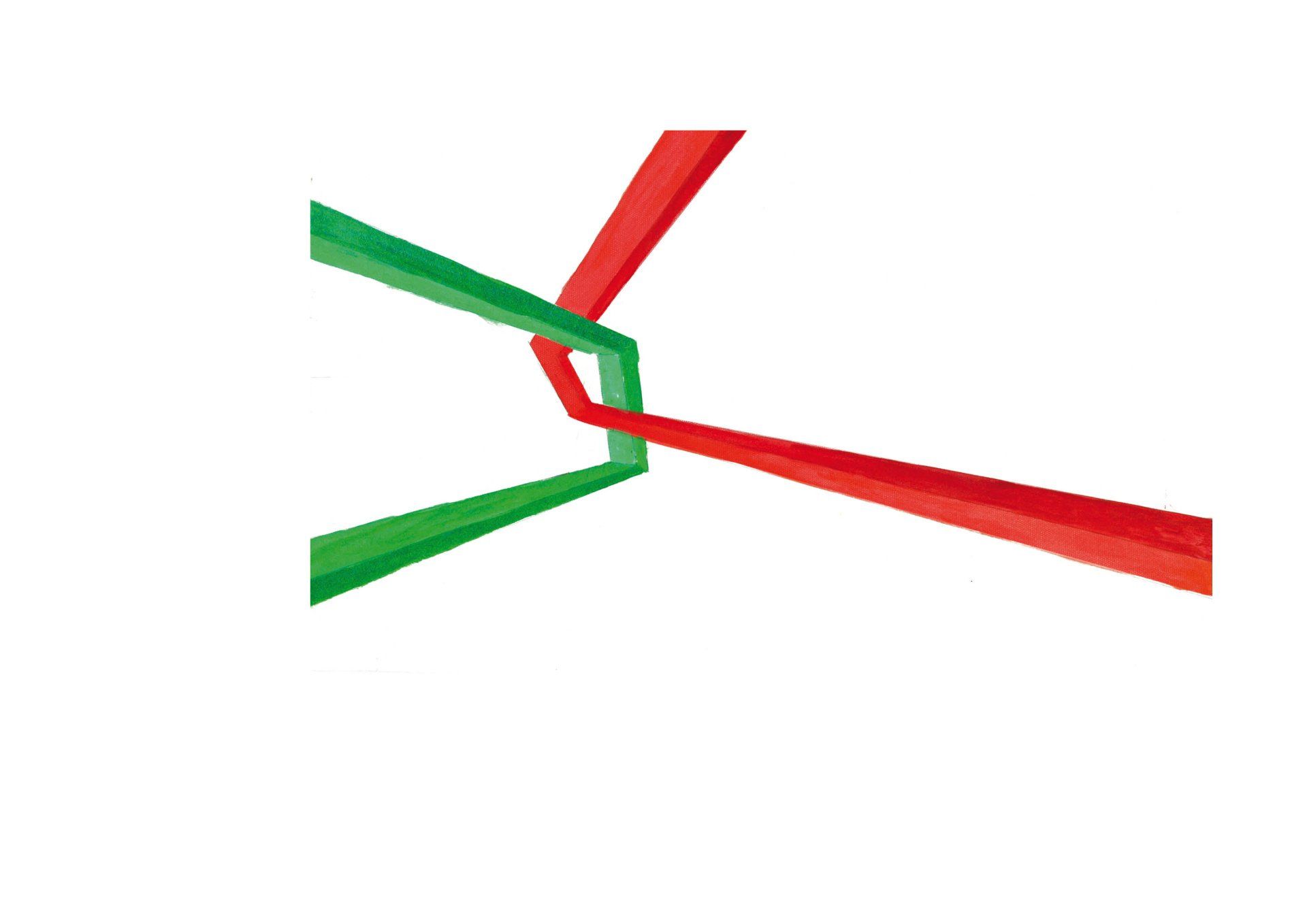 The subject shows two individuals (shown from a bird's eye view) who - coming from different directions and spaces (red rectangles) - meet each other in this place and interlock with each other in order to begin a rotating movement, the dynamics of which are reflected on the opposite wall and continues into the building.