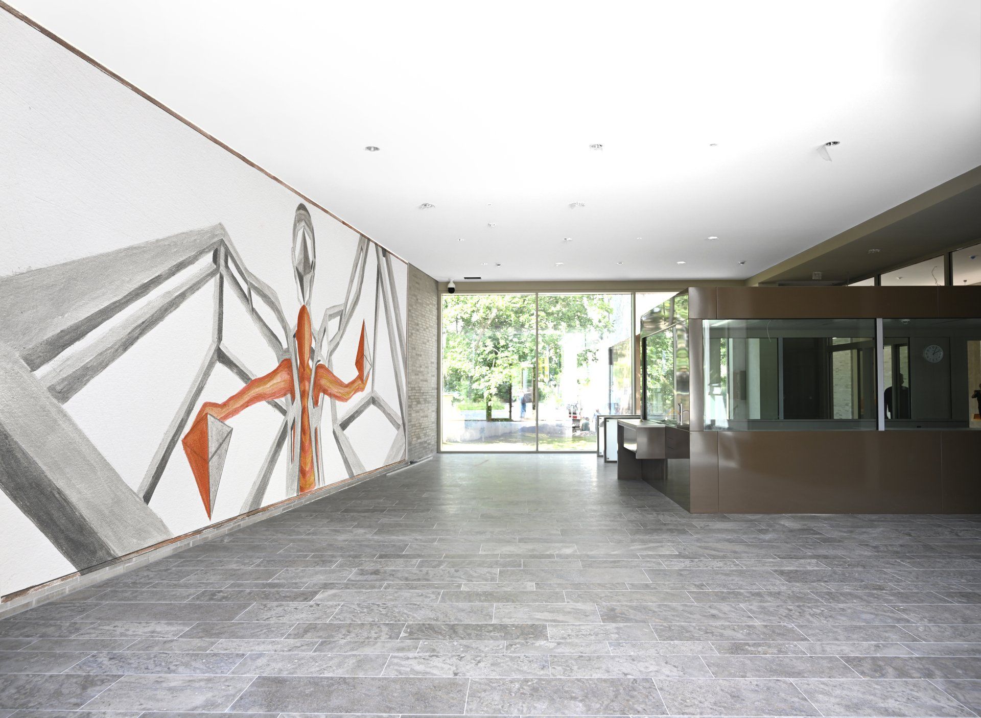The mural extends across the entire foyer and is done in black on white in the entrance area and white on black on the main wall - two contrasts, two ways of thinking that are complementary and all-encompassing: inside-outside, day-night, earth-space , Matter – Dark Matter.