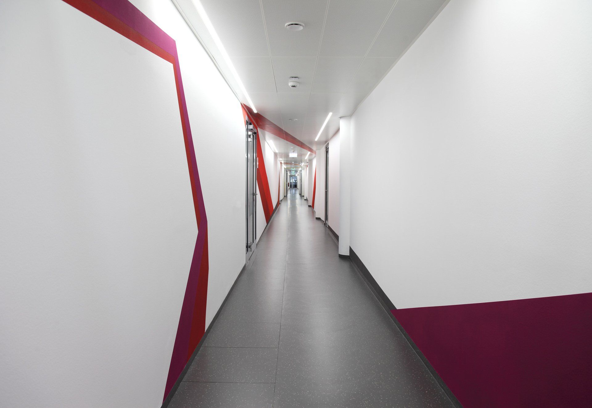 This corridor is a 110m long, narrow, low, artificially lit and monotonous space. The individual office doors cannot be clearly identified, making orientation particularly difficult for those unfamiliar with the building. The task here was to make practical use of the artistic design and to create an optical guidance system that optically also shortens this sheer length of the space.