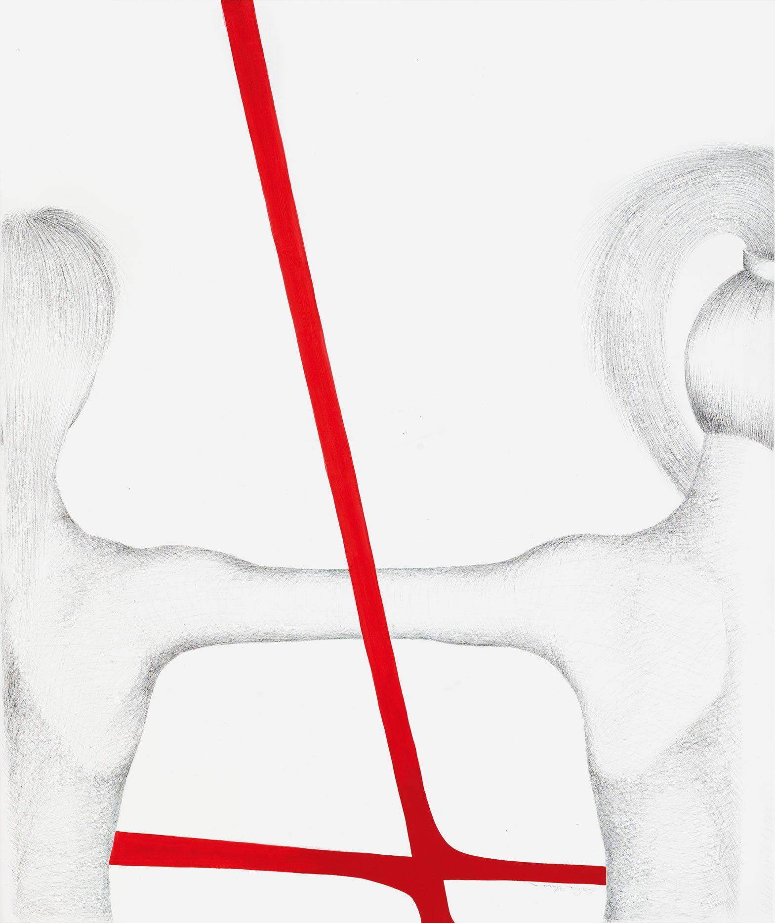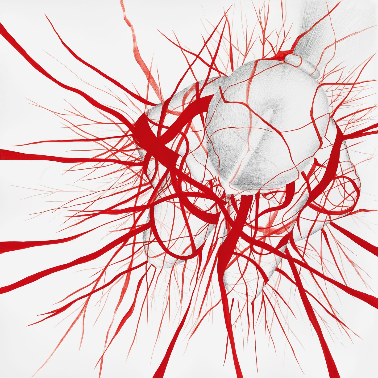 In the display case opposite, two works can be seen: an image with an abstract structure that does not yet have any clear physical characteristics and an image with an adult figure that is surrounded by red lines (vessels) in an embyonal position. The two images are connected by red lines and thus represent two snapshots of an evolutionary process.