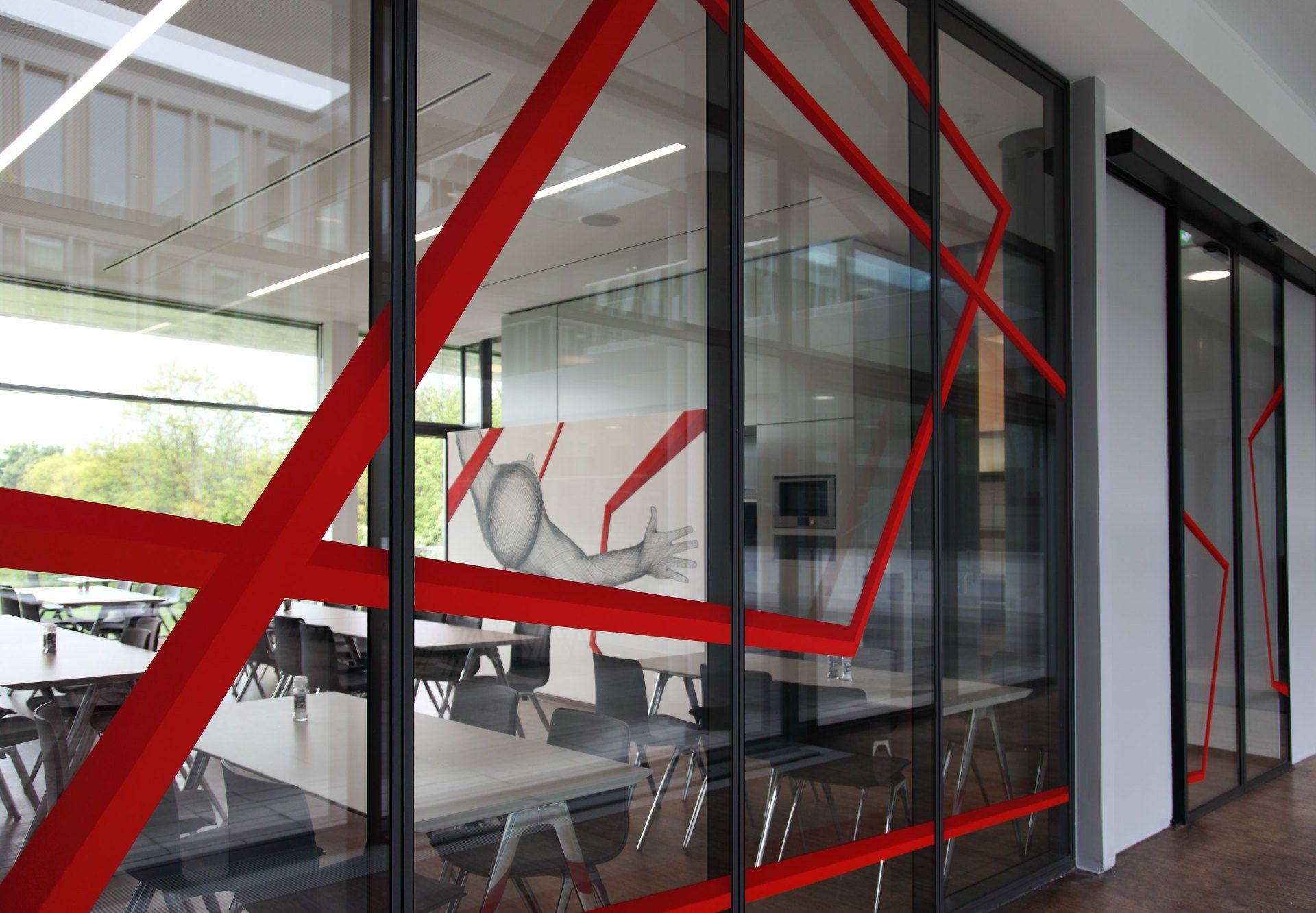 The conference rooms have glass walls facing the corridor, so in order to enable a more intimate conversation atmosphere, a visual separation was necessary while maintaining daylight permeability. I solved this requirement by continuing the motif of red rectangles here and in this way developing a formally subtle, translucent and effective optical separation through the color marking. (Material: walls: acrylic painting, glass walls: adhesive film).