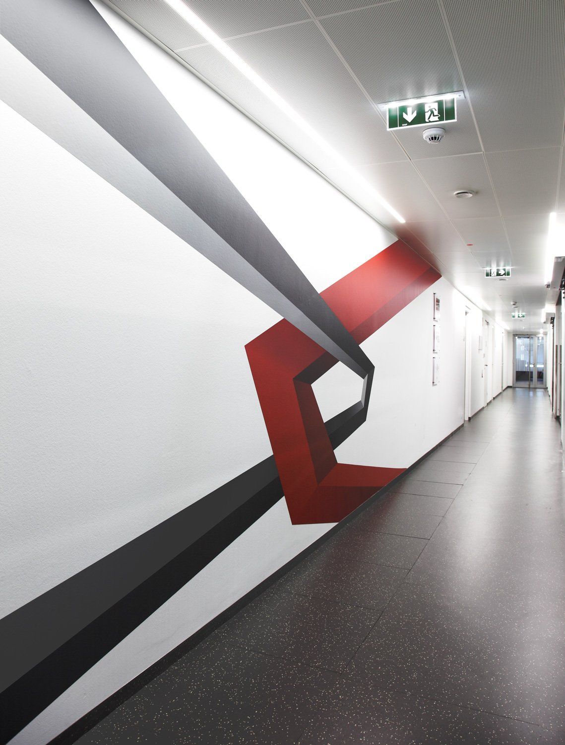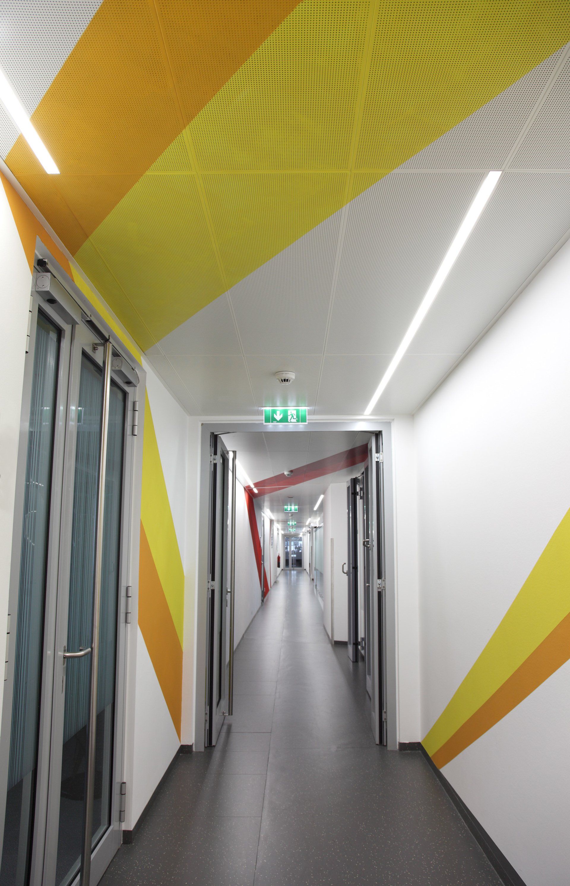 The corridor is 110m long and visually very monotonous (narrow, low, artificially lit). Visually it appears "infinite" because you cannot clearly see the individual office doors, making orientation very difficult, especially for those unfamiliar with the area. The task here was to use the artistic design practically and on the one hand to create an optical guidance system and at the same time to visually shorten this sheer length.