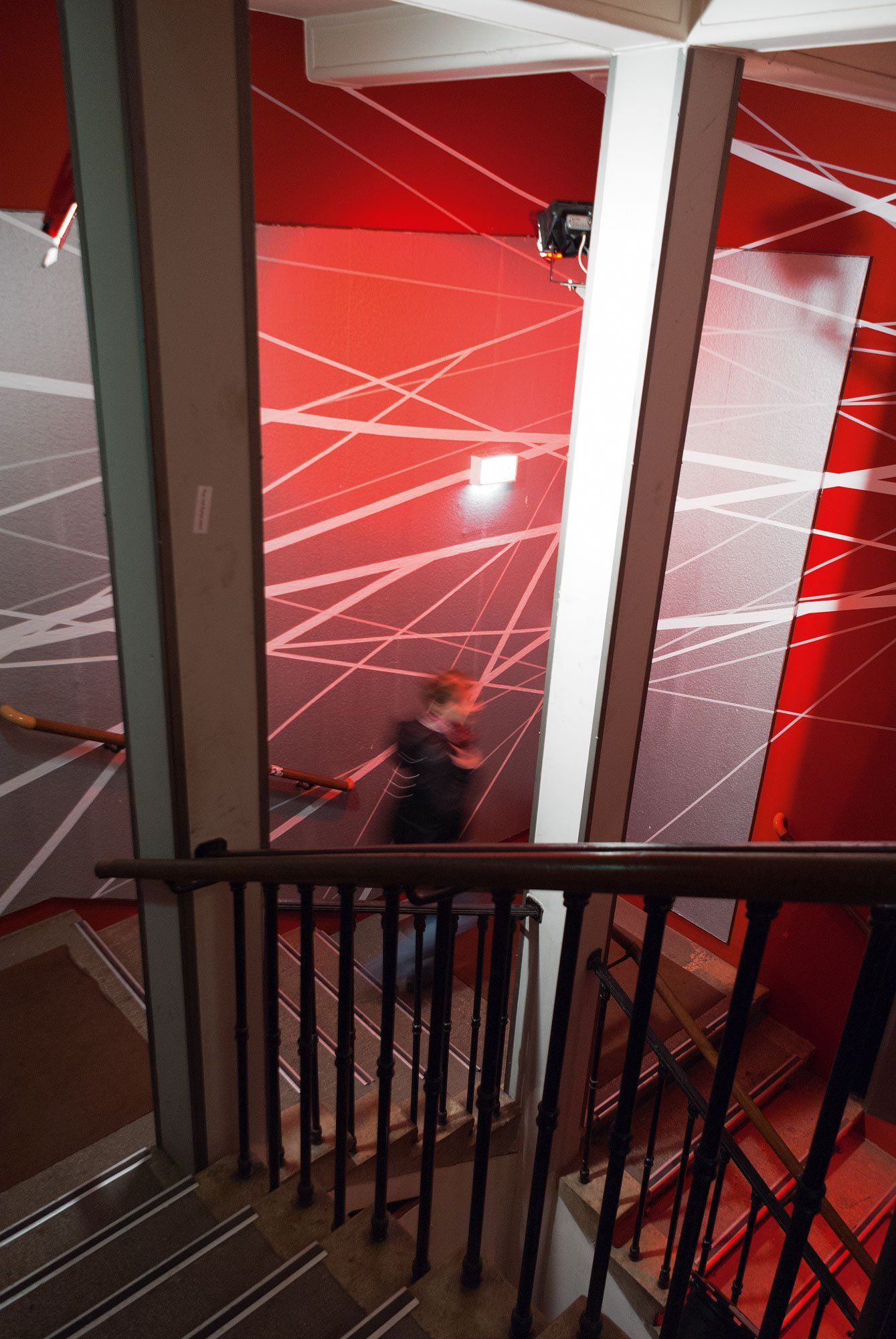 In 2010, as part of the "Sauna" art festival, this expansive installation was created in the staircase (escape route) of brut in the Vienna Konzerthaus: a spiral that begins with the two figures in the picture continued outside the picture in white lines along the staircase.