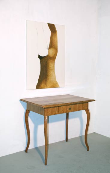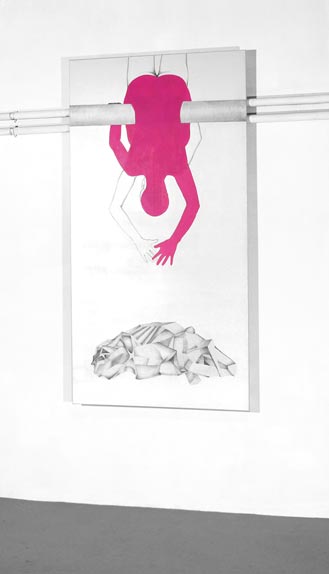 Es sind Bilder, die gleichzeitig als plastische Objekte konzipiert sind: Zeichnungen, die am Boden liegen oder frei im Raum stehen, wie das Diptychon einer durch die Wand gehenden Figur: Sie tritt, als Fragment eines Oberkörpers, auf der einen Seite der Bildwand
