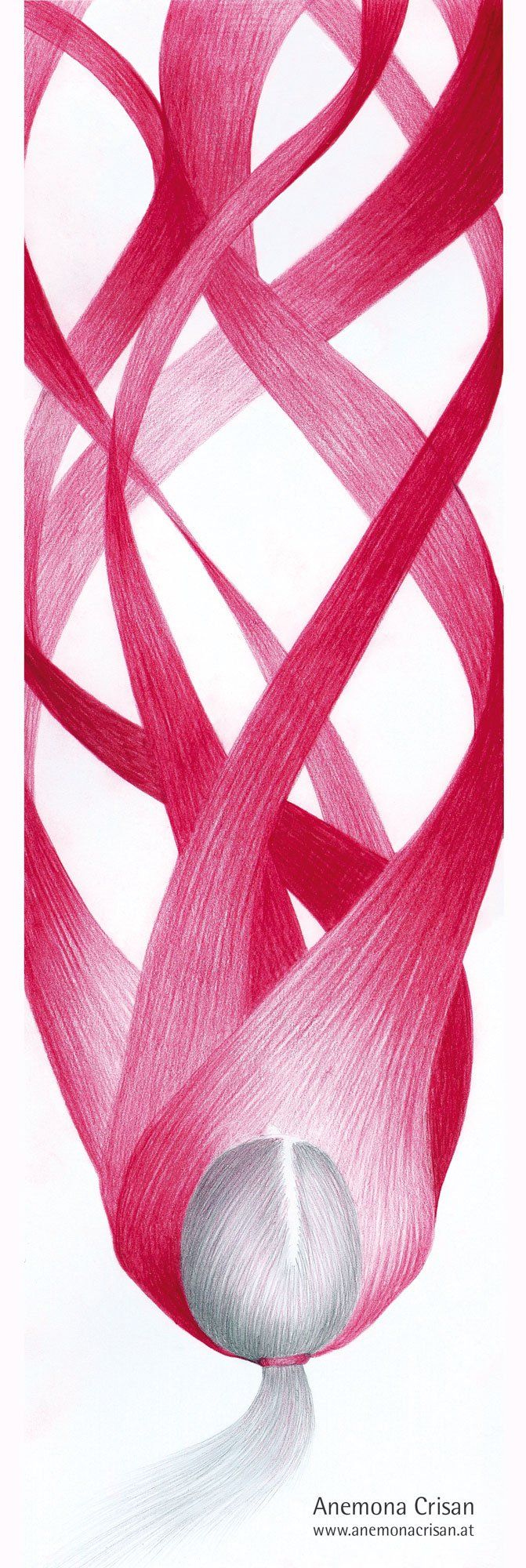 Der Innenraum der Litfasssäule wird zum Lebens-Raum einer Figur: Von einem Körper ausgehend winden sich rote Schleifen die zylindrische Säulenform nachzeichnend nach oben. Die Figur scheint innerhalb dieses Säulen-Innenraums zu schweben und erinnert an ein Lebewesen in einem Aquarium, oder eine menschliche Phantasie, die nur in diesem Raum/Medium, gleich einem Präparat im Museum, existieren kann. Die (über)lebensgroße Figur wird auf diese Weise zu einem "Gegenüber" der realen PassantInnen, die mit der Frage konfrontiert werden: Was würde geschehen, wenn dieses Wesen seinen Raum verlassen könnte?