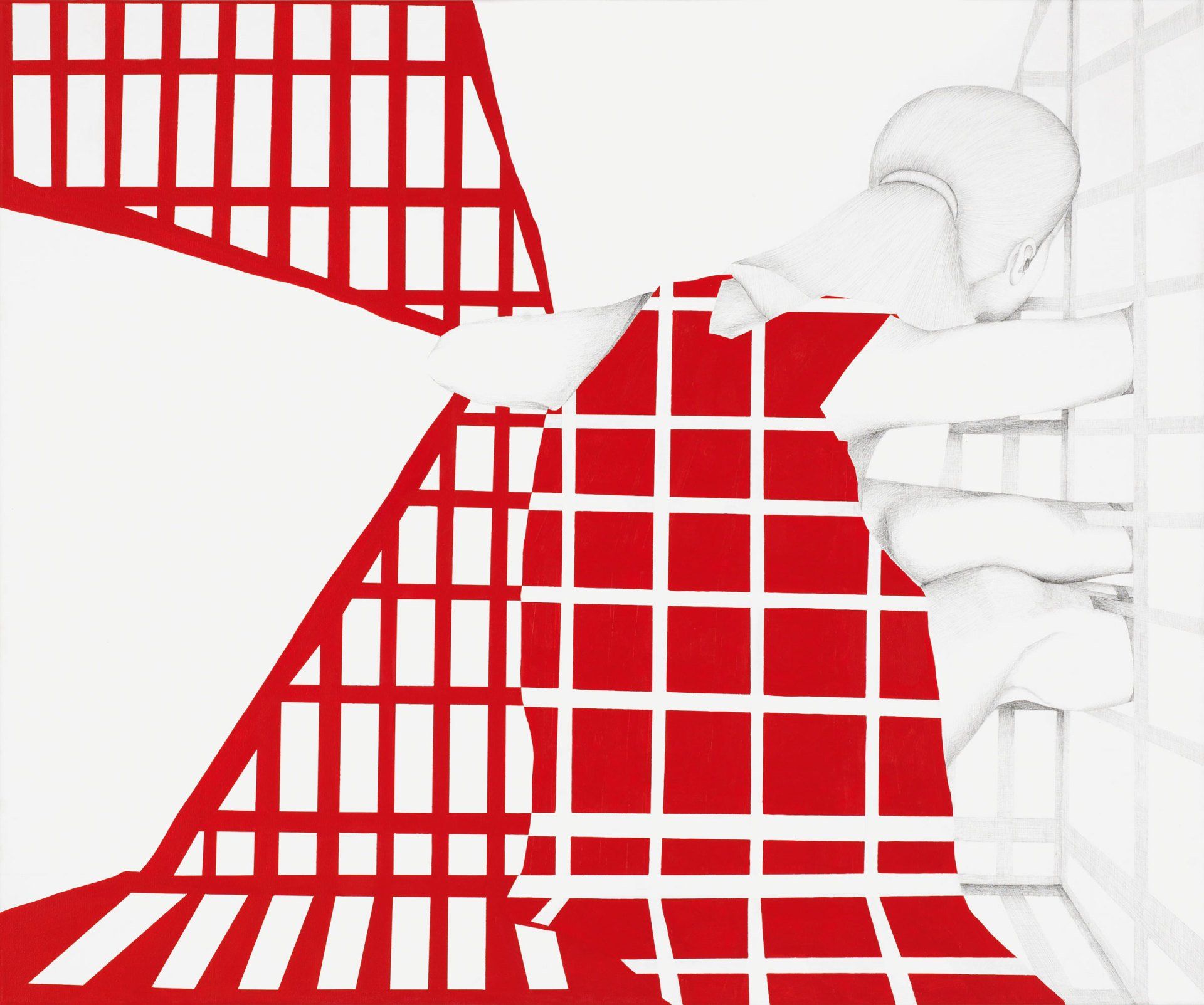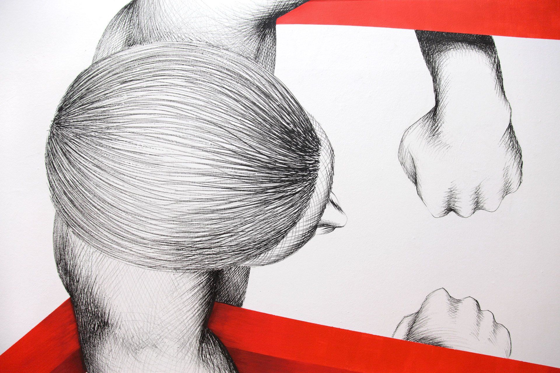 Wand: Tuschezeichnung und Acrylmalerei, Kuben: Holz, Latexfarbe.