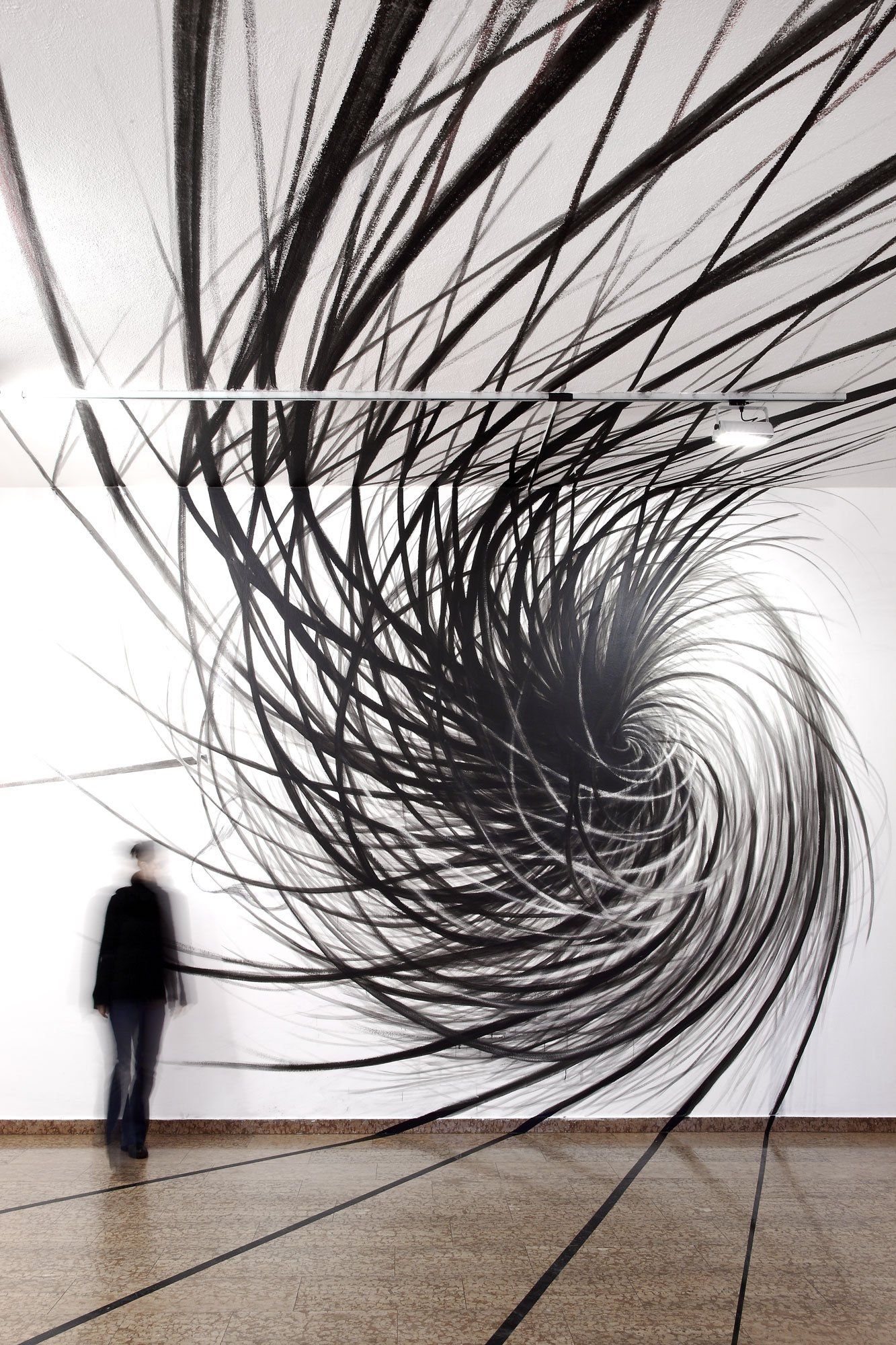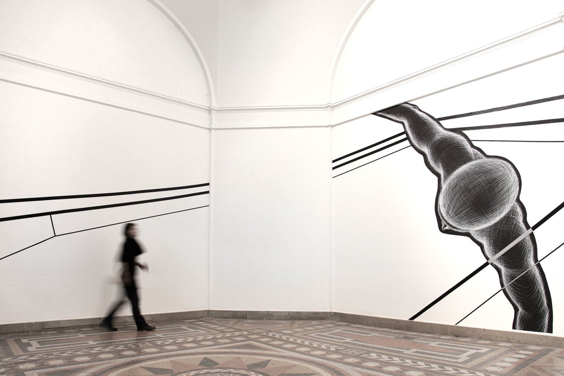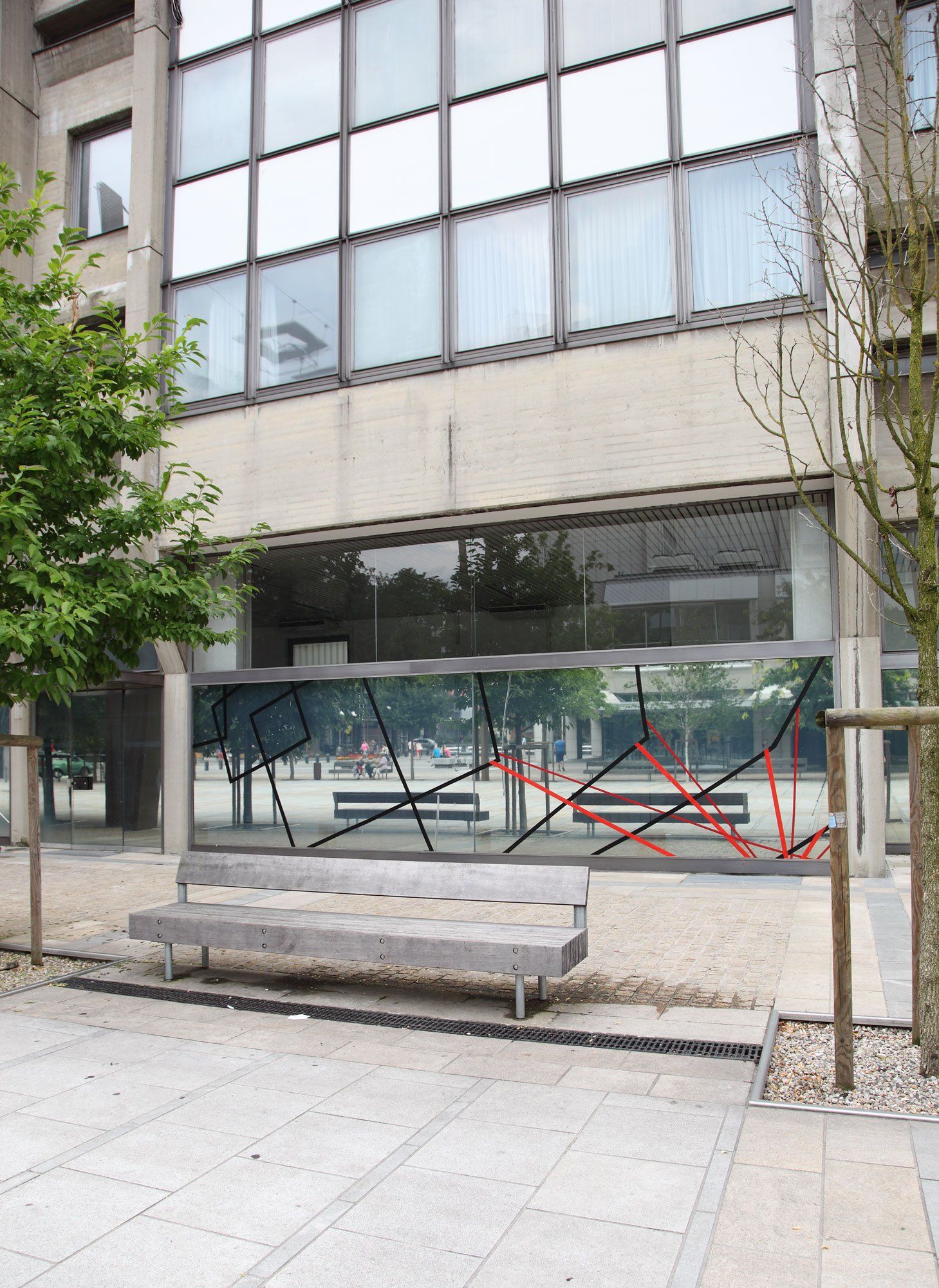 Wand: Tuschezeichnung und Acrylmalerei, Glas: Folien.