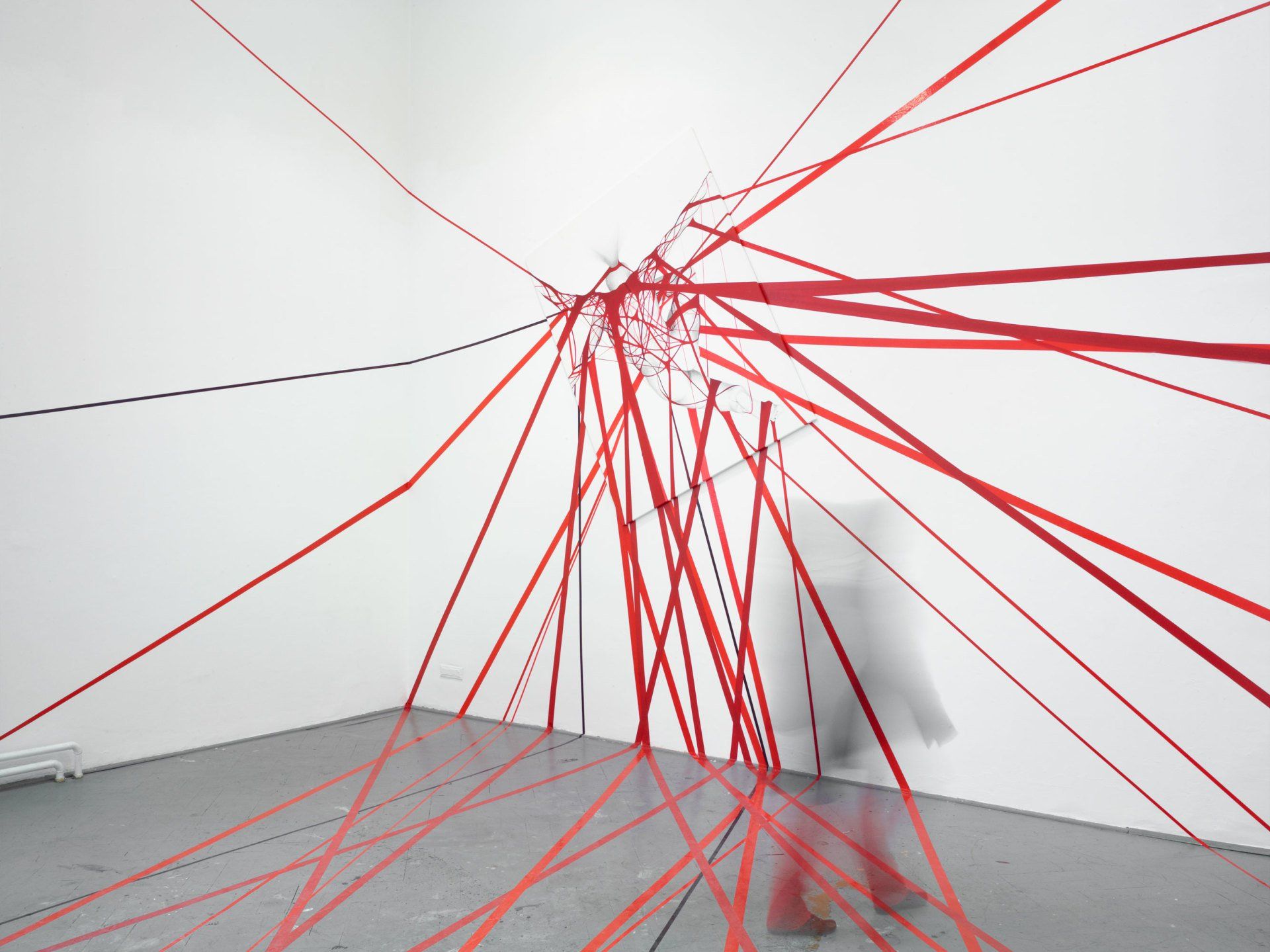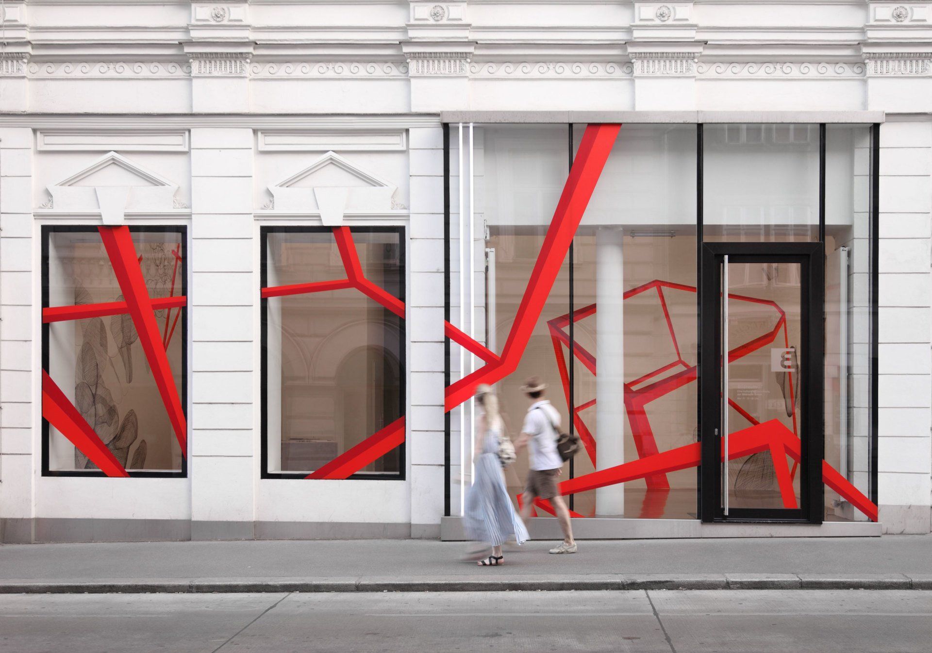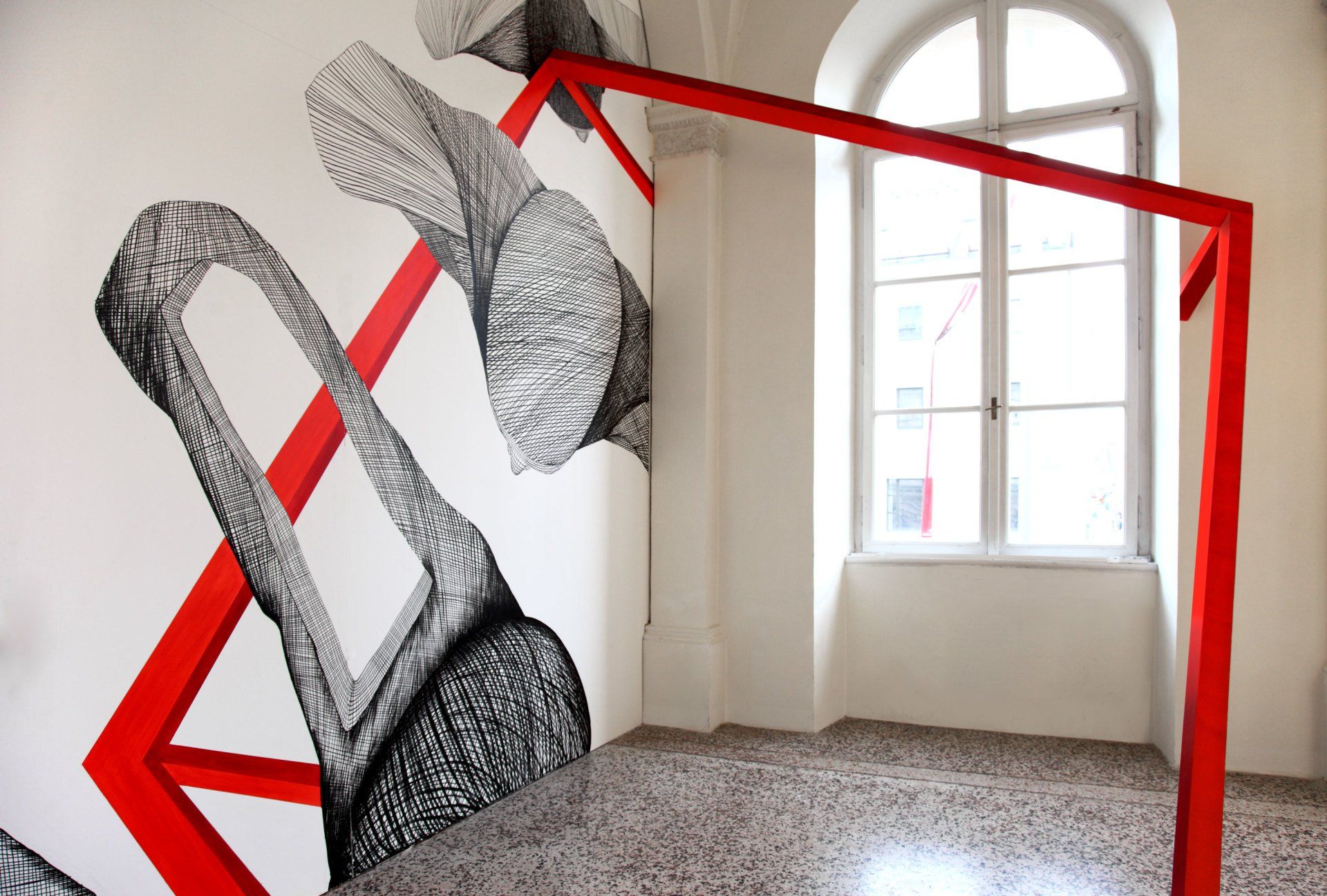Wand: Tuschezeichnung und Acrylmalerei, Glas: Folien.