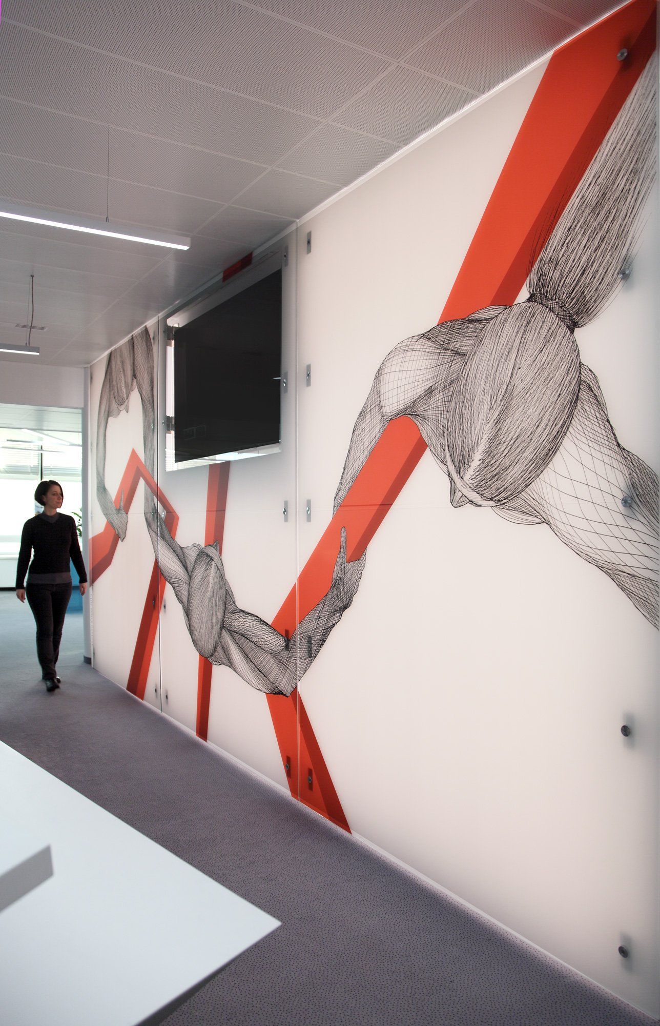 Execution: corridor: acrylic painting in situ, reception: glass foil printing, sales rooms: printing on plexiglass.