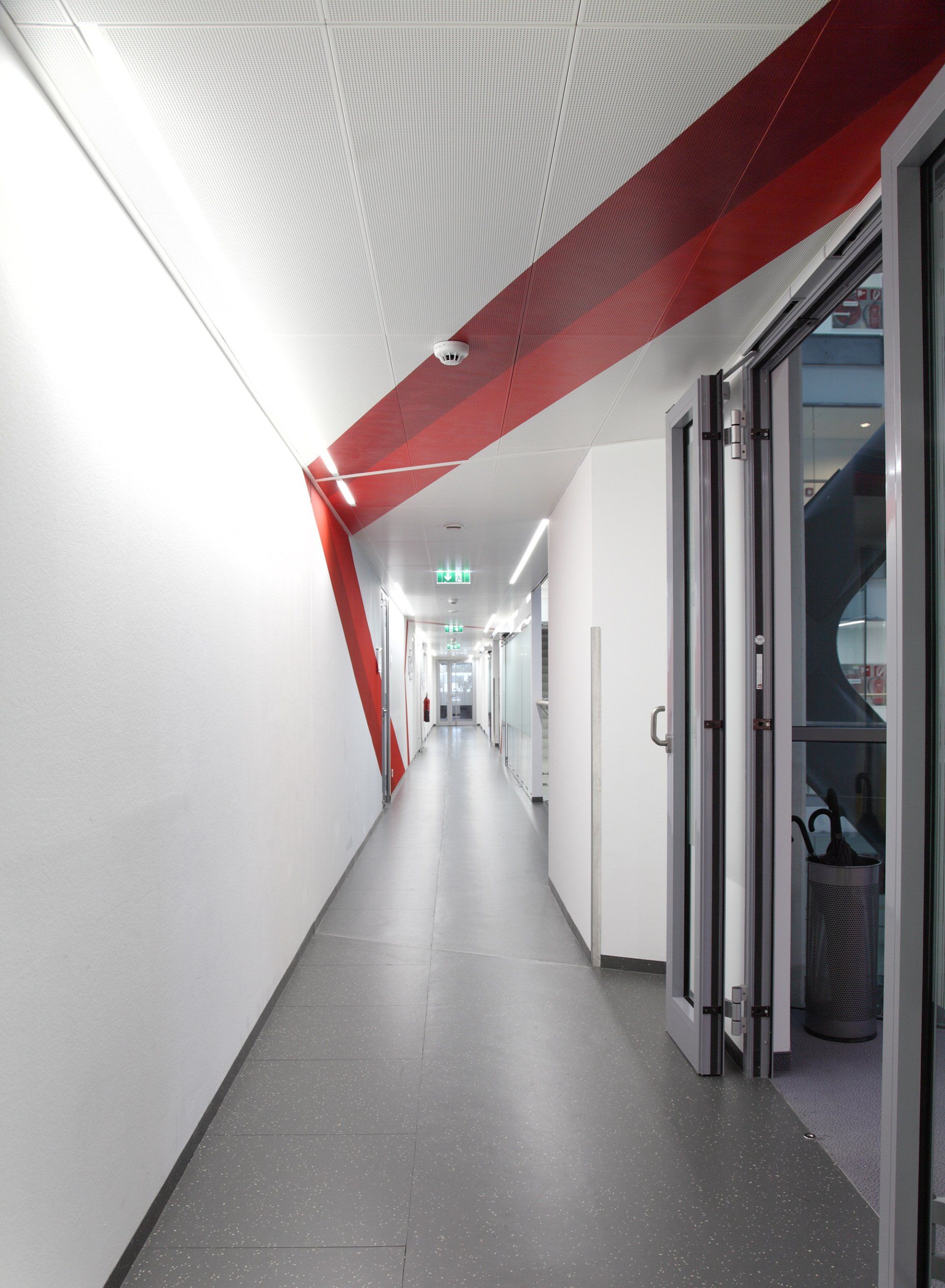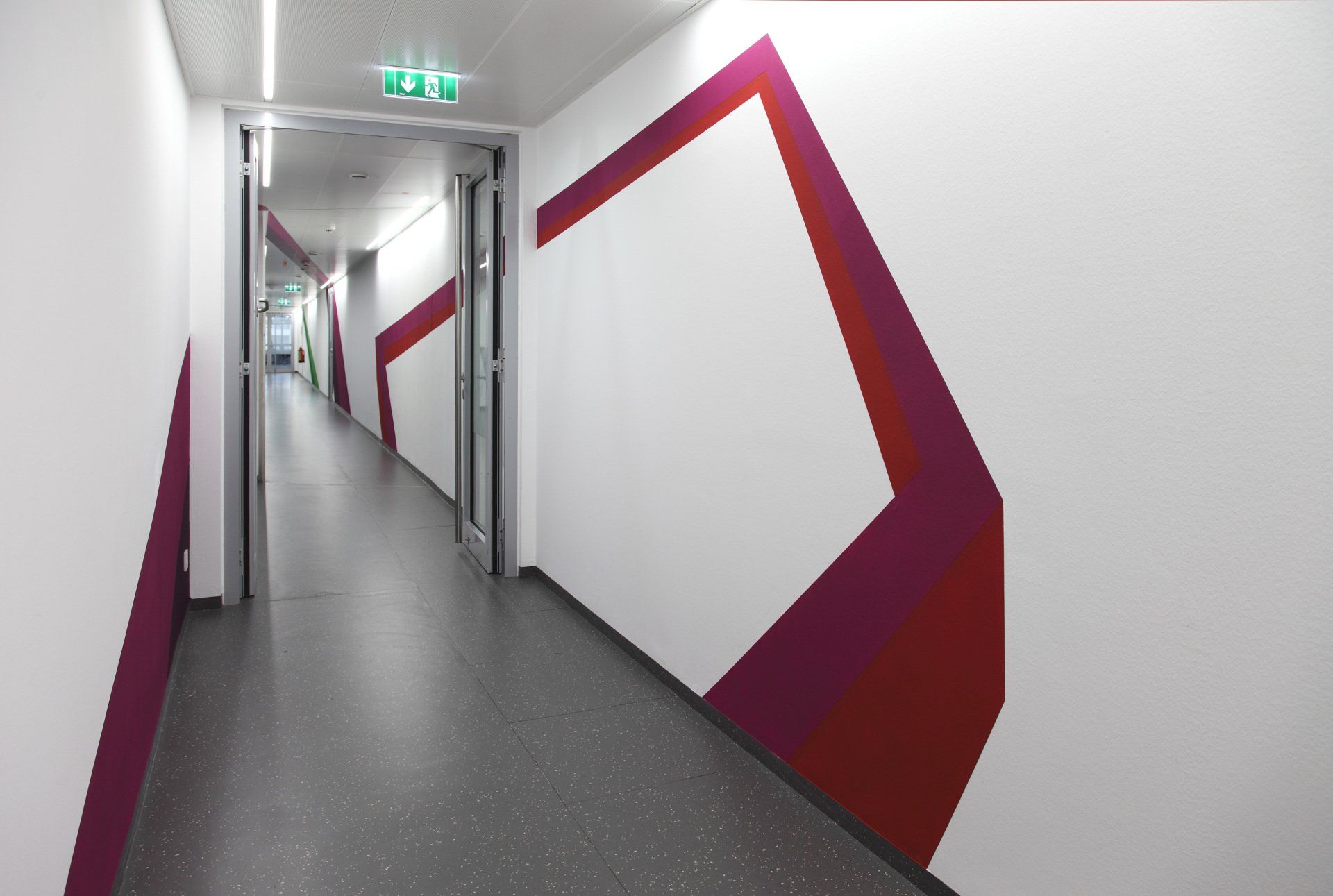 This corridor is a 110m long, narrow, low, artificially lit and monotonous space. The individual office doors cannot be clearly identified, making orientation particularly difficult for those unfamiliar with the building. The task here was to make practical use of the artistic design and to create an optical guidance system that optically also shortens this sheer length of the space.