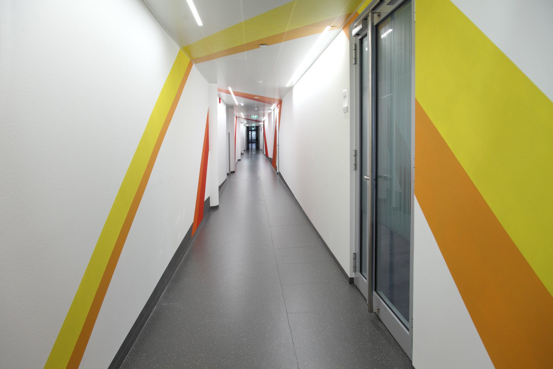 I succeeded in doing this by introducing distorted, colored arches as design elements, each of which leads to a door, thus marking the office entrances for better orientation at a distance. In addition, these arches divide the corridor into segments, a visual effect that makes the corridor seem shorter, than it actually is.