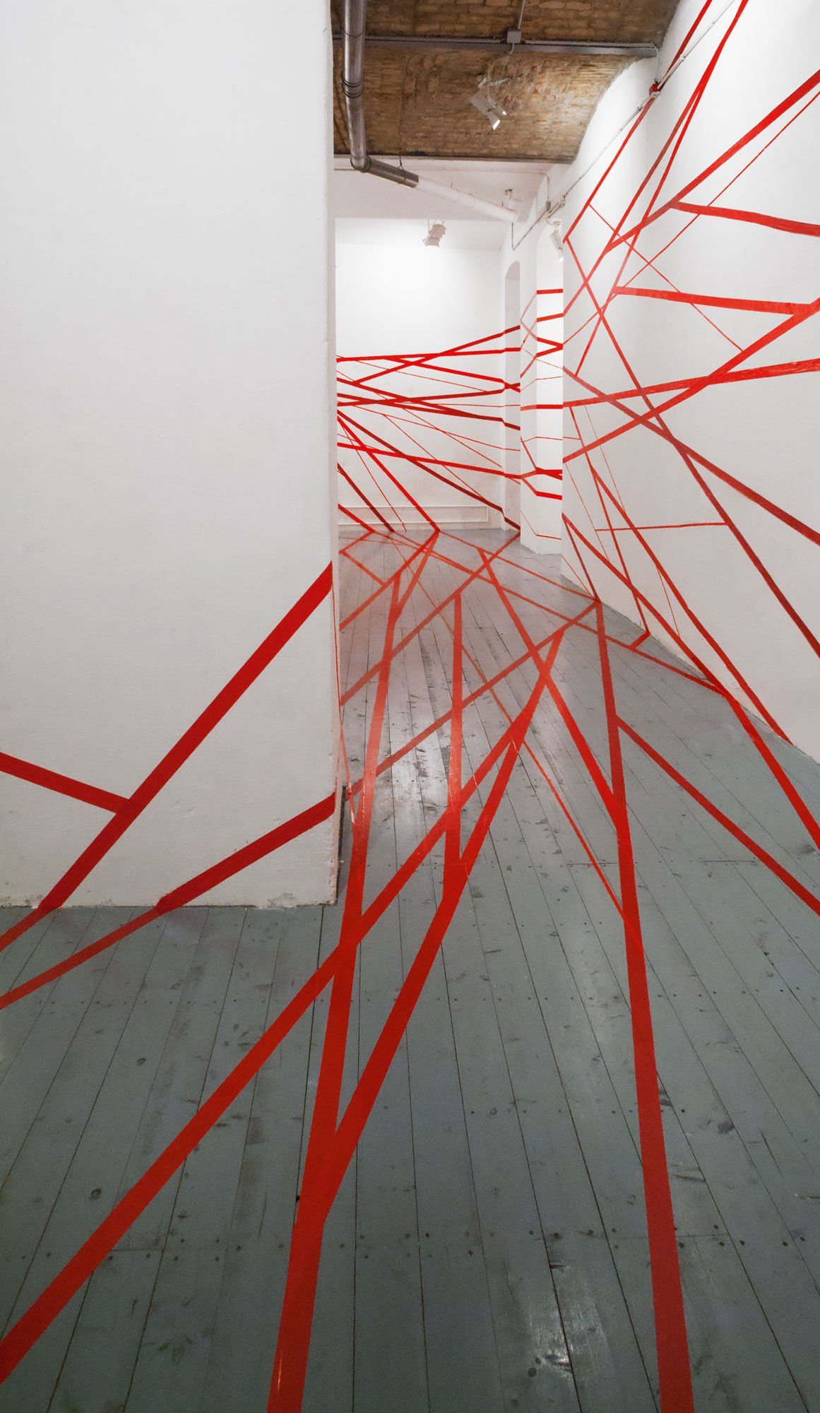 The painting depicting a woman's body rearing up against red ribbons, ropes - is expanded into the surrounding space with red tapes. The real space is conquered and occupied by the body. The viewers step into the space and into the work at the same time and cannot physically evade it; like the figure depicted, they become part of the work, teammates. In this way, image and space form a new unity, which is specific to the given location, literally tailored to the respective space.
