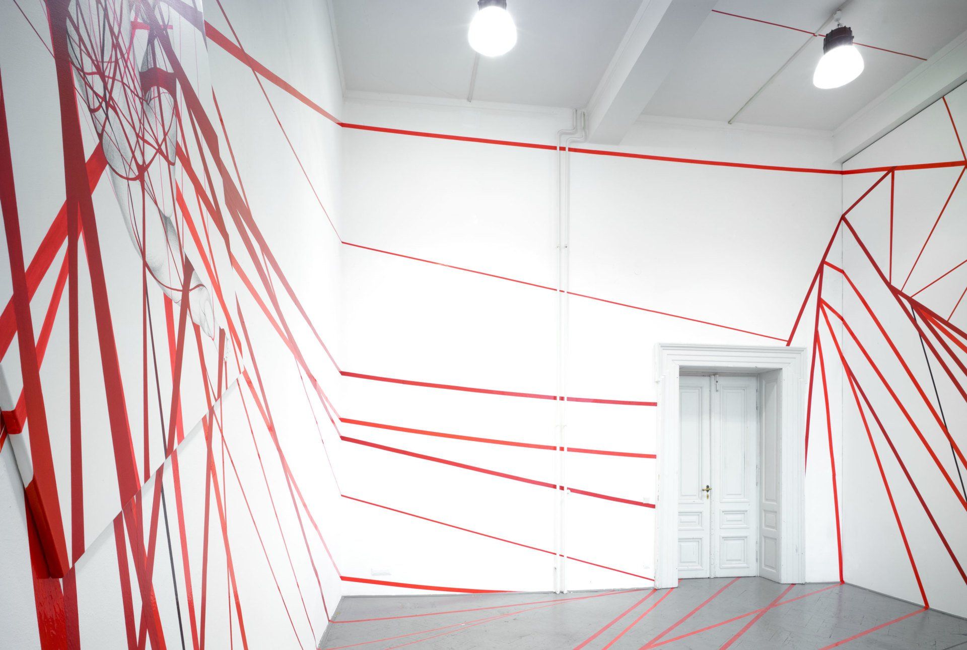 The painting shows an Icarus-like figure with three arms that tries to fly away and free itself from the red lines that hold it back, but that have also supported and nourished it in the past. This figure thus becomes the starting point from which the dynamic of the expansive installation spreads into the surrounding space - including the walls, ceiling and floor - and thus envelops the visitors. The trompe l'œil lines tilt the spatial axes and create a vertigo that gives the emotional tension an additional physical feeling of insecurity.