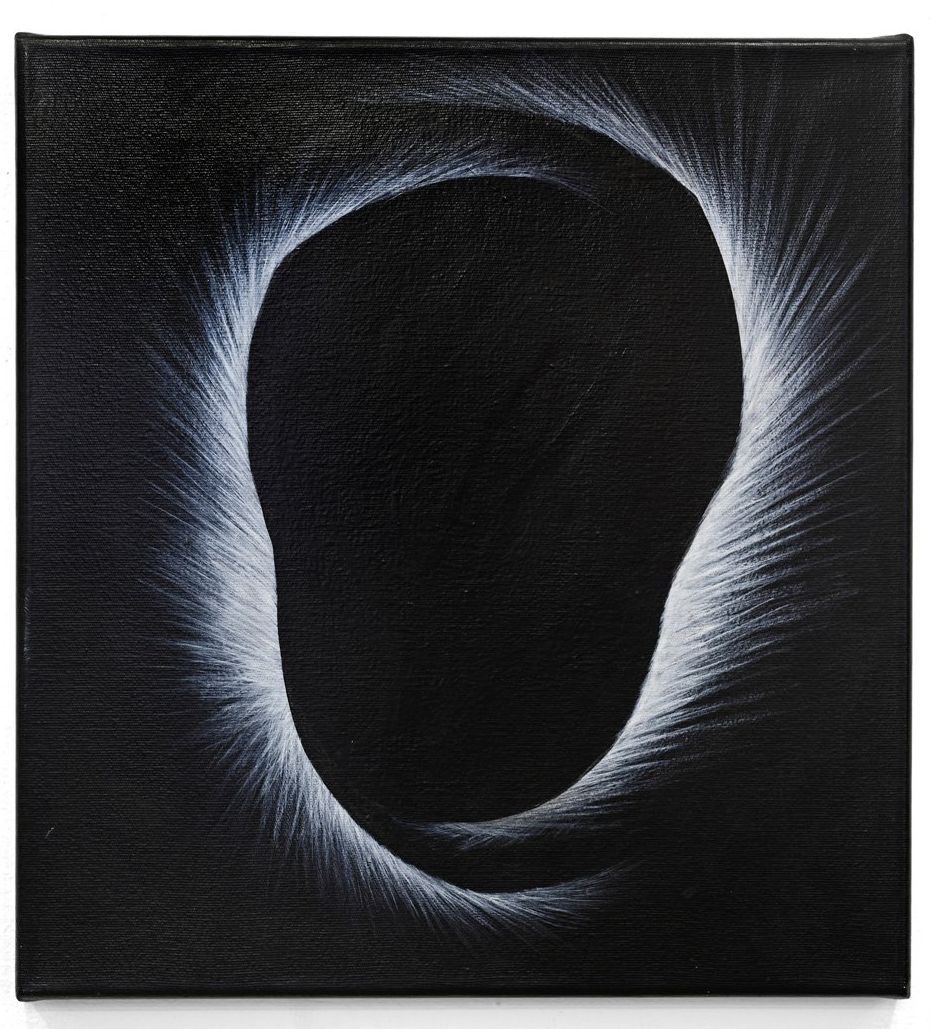 In this work, which also depicts an abstract head made up of two structures facing each other. W are only able to see the radiant light because it is obscured by the darkness (as in an eclipse).