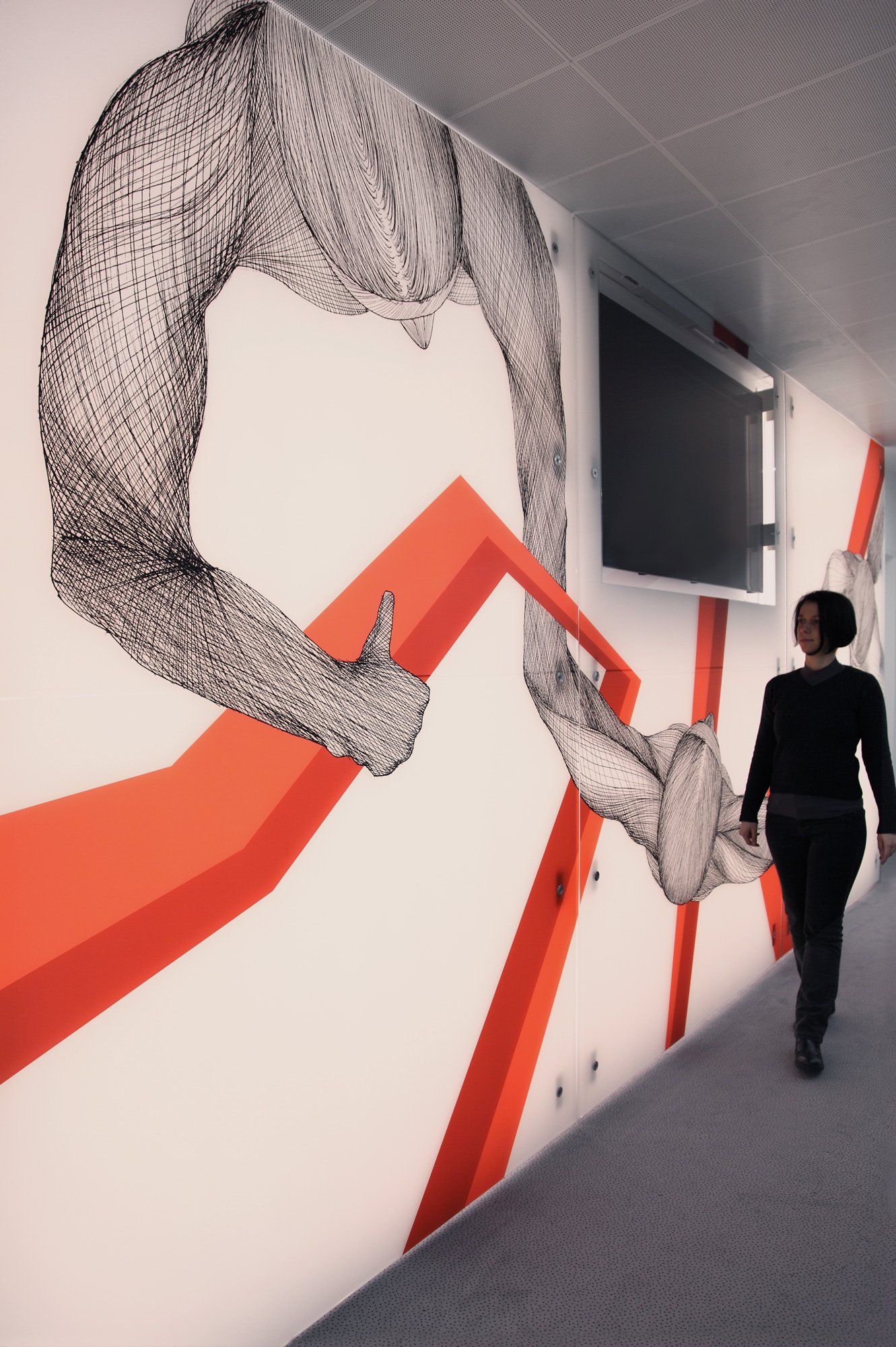 As the final step in the design process, I collect these impressions and allow them to combine to form an imaginary story in my mind, which then serves as the foundation for creating site specific art work, typically through hand-drawing and painting on walls, floors, ceilings, and windows.