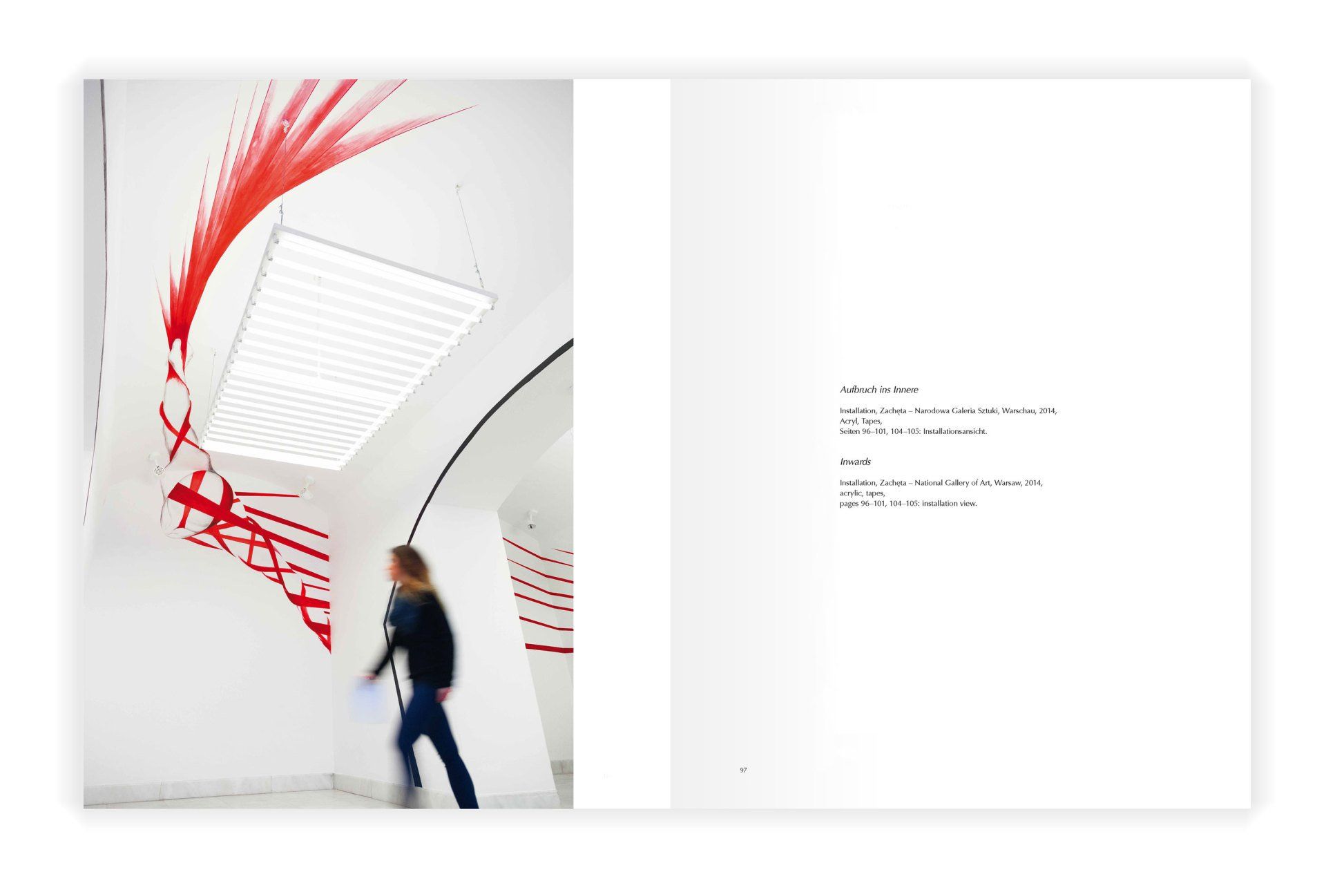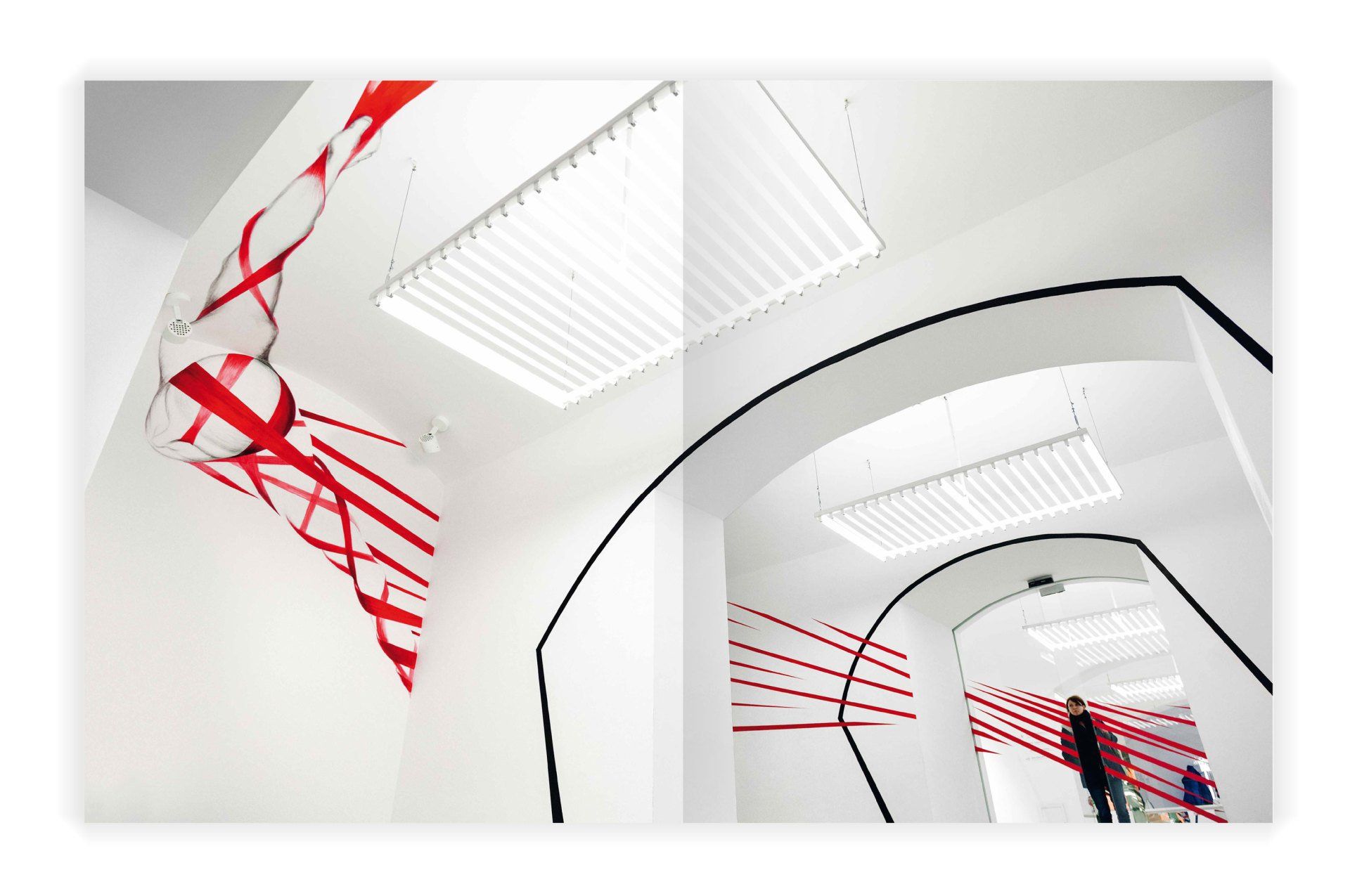 “The figure grasps the space, occupies, shifts and tilts it. Through the red lines, it connects the architecture to its own body and assimilates the surrounding space. The installation spreads a virtual onto the factual space. There are points where these two spaces overlap, and other points where the constructed space exceeds the factual one, strays like a trompe l'oeil against its spatial parameters. At the same time the installation is walkable, the viewer becomes part of the work, per-ceiving it physically.”
