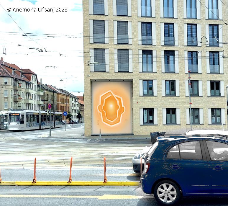 An diesem Punkt möchte ich noch einmal auf die abstrakten Kop- fumrisse hinweisen die nicht nur für das Individuum in der Gemein- schaft stehen sondern auch die unterschiedlichen Funktionen und Rollen, die diese Menschen einnehmen. Es geht um den Beitrag, den Menschen in ihrer Funktion in die Gemeinschaft tragen und die Zuwendung, die sie in ihrer Rolle als Teil der Gemeinschaft erfahren. Das Werk zieht den Blick der Passanten an, so wie ein uns anschau- endes Gesicht es immer tut. Es ist das Gesicht, die Visitenkarte dieses Gebäudes und Areals. Es lädt uns ein einzutreten in diese eigene Welt.